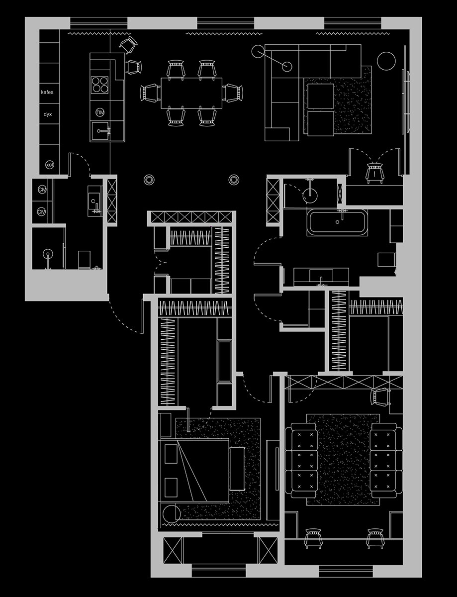 Кухня-гостиная площадью 50 кв. м включает в себя зону отдыха с угловым диваном и телевизором, спрятанным за декоративную ширму, обеденную зону со столом на 6 человек, кухню с островом, зону библиотеки и небольшой рабочий стол, скрытый стеклянными перегородками.