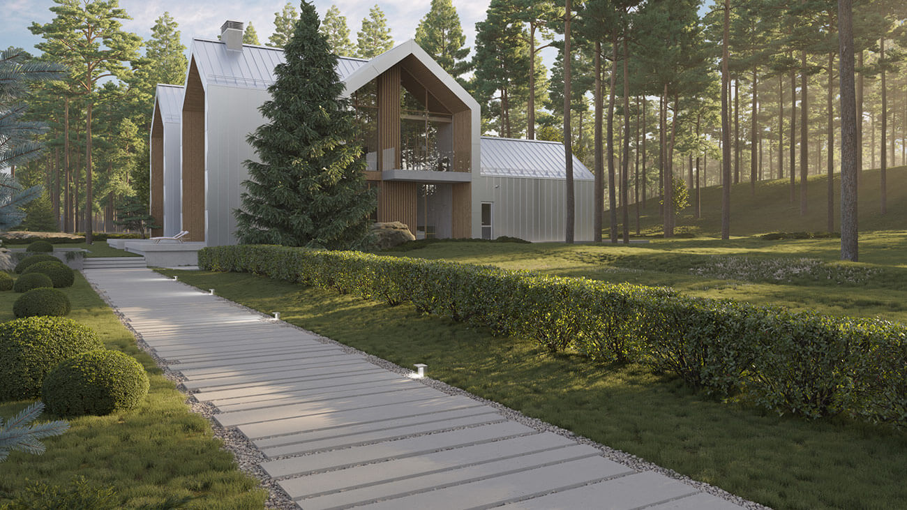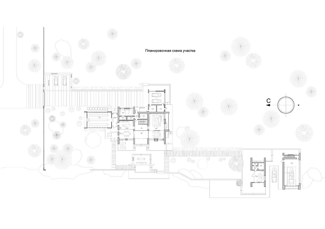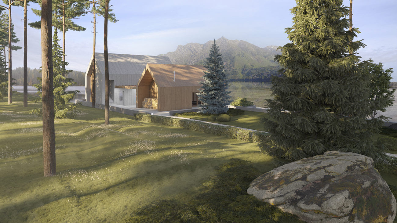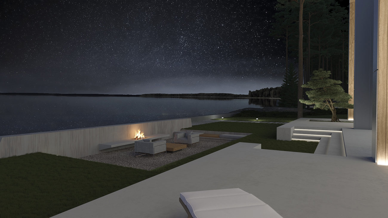 Эко-концепция проекта предполагает максимальное использование особенностей ландшафта, местных деревьев и растений: скалистого берега озера, валунов на участке, соснового бора, мхов и лишайников.