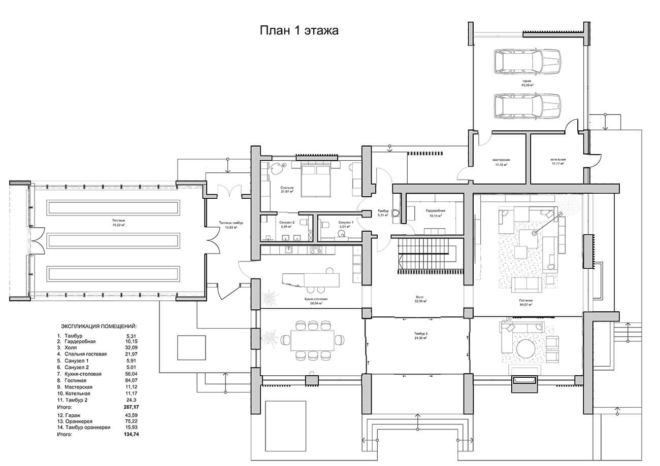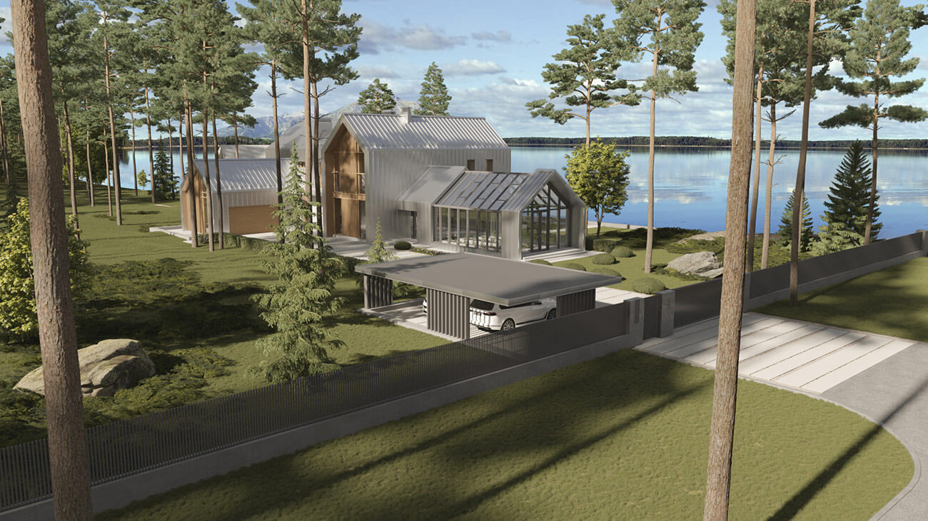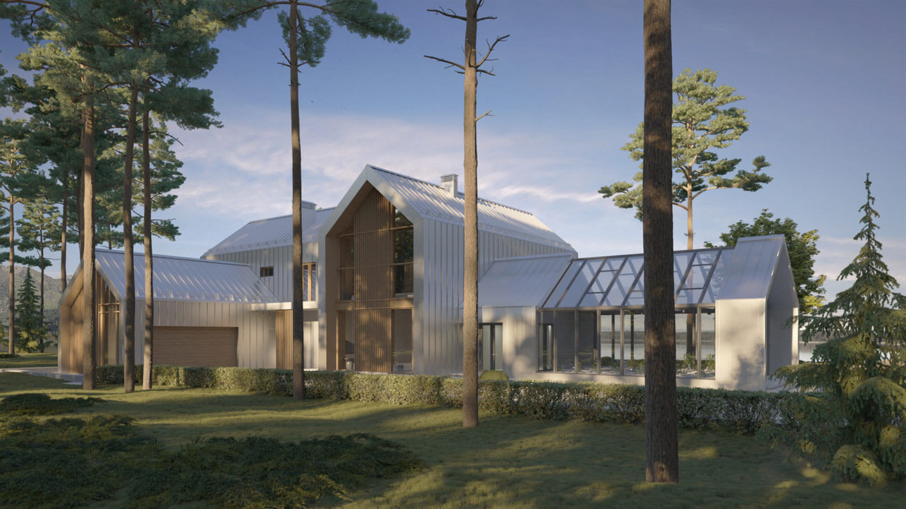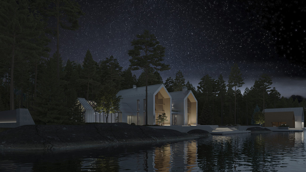 Дом предназначен для круглогодичного проживания гостеприимной семьи из четырёх человек. Усадебный комплекс включает в себя: непосредственно дом с оранжереей, навес для автомобилей, эллинг с баней, причал с каминной зоной.