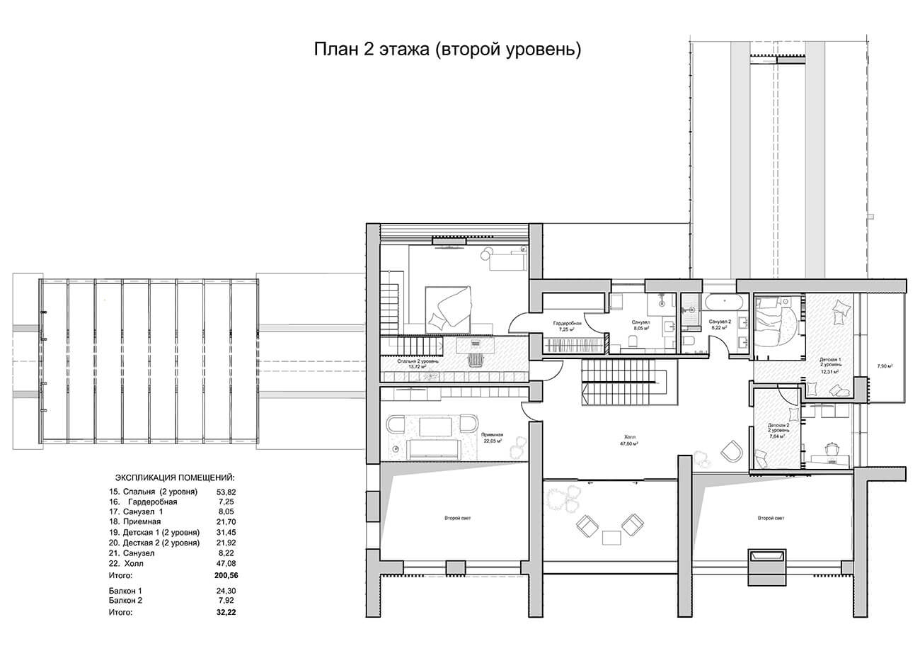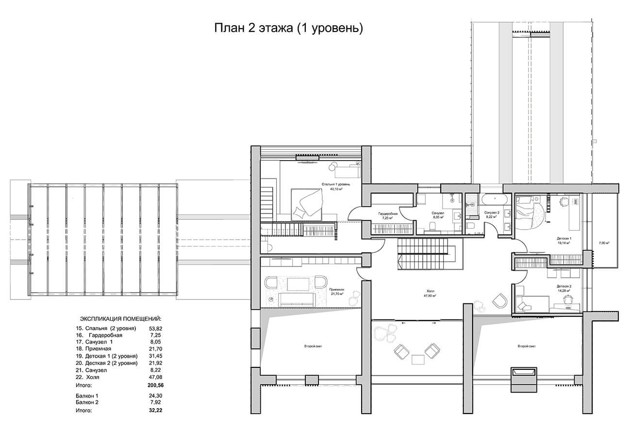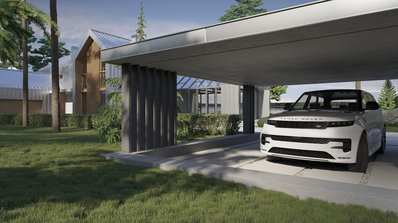 Дом предназначен для круглогодичного проживания гостеприимной семьи из четырёх человек. Усадебный комплекс включает в себя: непосредственно дом с оранжереей, навес для автомобилей, эллинг с баней, причал с каминной зоной.