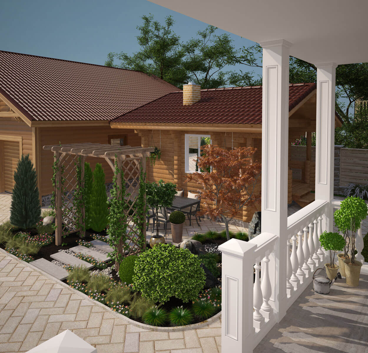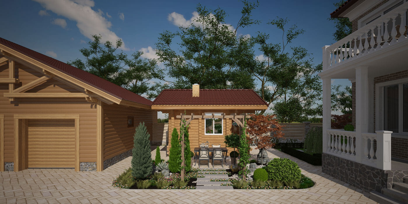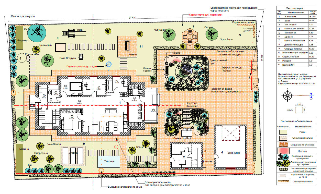 Ландшафтный проект для дома, в котором проживает семья из трех человек. Задача состояла в том, чтобы создать внешнее пространство с учетом законов природы и высших законов сознания, улучшить взаимоотношение в семье и ее благополучие, нормализовать здоровье и духовный рост. Выполнить данную задачу нам помогла наука Васту. Обладая знаниями гармоничного проектирования можно построить дом и благоустроить участок, в котором всегда будет хорошее настроение, здоровье и благочестие. Земля, на которой стоит дом, может дать силы не одному поколению и может также их отнять. Это нужно учитывать при выборе участка и его наклона. Мы выбрали участок земли, правильно расположенный по сторонам света, с наклоном с севера-запада на юго-восток, имеющий качество – «процветание». При проектировании ландшафта важно учитывать, где подводить газ, воду, электричество и канализацию. Дом и участок – как живой организм; все, что там находится и то, что окружает, должно быть на своем месте и выполнять свои определенные функции. Все, что противоречит природе, может привести к болезням, финансовому краху и простому не везению в жизни. В зоне воды мы спроектировали японский садик с прудом, здесь же благоприятное место для подключения воды в дом. Вся северо–восточная часть участка предназначена для созерцания и медитации. Она свободна от МАФ, свободна от высоких деревьев – здесь должно быть легко и красиво. В зоне огня разместили баню с гаражом, и определили место для подключения электричества и газа в дом. А в зоне земли – лучшее место для вывода канализации и септика. Западную и южную сторону участка мы укрепили высокими колючими деревьями и кустарниками. Ежевика, ель, крыжовник, высокие туи будут защищать от негативного воздействия окружающей среды, а также давать невидимую опору и чувство защищенности проживающих в доме людей. Зона воздуха (северо – запад) предназначена для активности и подвижности, мы здесь разместили детскую площадку. Плодово-ягодные деревья и кустарники, огород спроектировали в южной части участка. В этом месте будет большой сбор урожая. Каждое растение имеет свой характер, с которым оно делится с человеком. Так крыжовник защищает от врагов. Кедр и плодовые деревья – поддерживают жизнь. Сирень, жасмин – цветущие деревья наполняют праной, а через запах приходит благость. Ежевика очищает пространство. Проектируя этот участок - мы хотели сделать жизнь людей успешной, наполнить детским смехом, счастьем, красотой и изобилием!