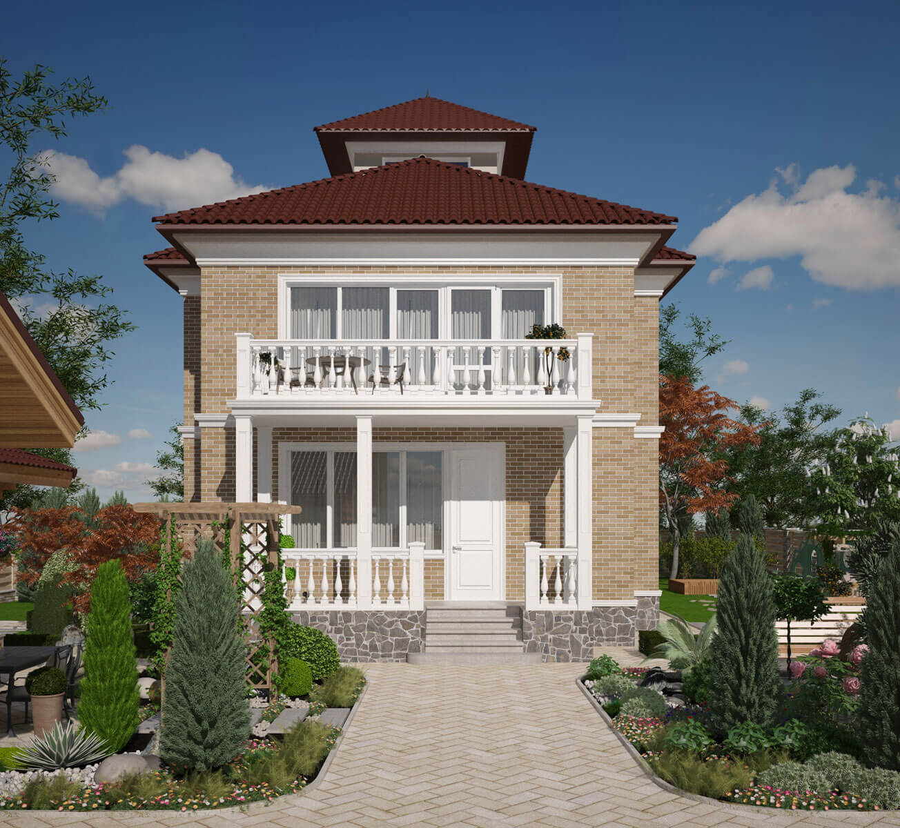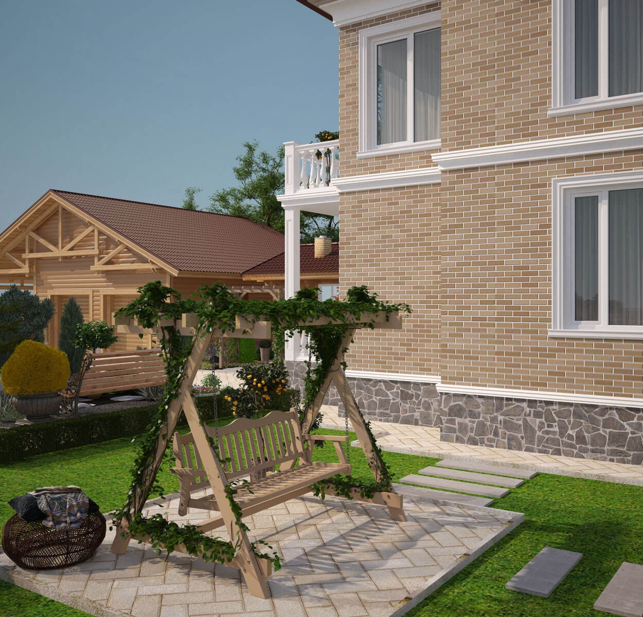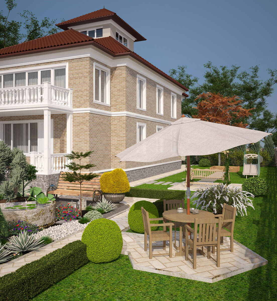 Ландшафтный проект для дома, в котором проживает семья из трех человек. Задача состояла в том, чтобы создать внешнее пространство с учетом законов природы и высших законов сознания, улучшить взаимоотношение в семье и ее благополучие, нормализовать здоровье и духовный рост. Выполнить данную задачу нам помогла наука Васту. Обладая знаниями гармоничного проектирования можно построить дом и благоустроить участок, в котором всегда будет хорошее настроение, здоровье и благочестие. Земля, на которой стоит дом, может дать силы не одному поколению и может также их отнять. Это нужно учитывать при выборе участка и его наклона. Мы выбрали участок земли, правильно расположенный по сторонам света, с наклоном с севера-запада на юго-восток, имеющий качество – «процветание». При проектировании ландшафта важно учитывать, где подводить газ, воду, электричество и канализацию. Дом и участок – как живой организм; все, что там находится и то, что окружает, должно быть на своем месте и выполнять свои определенные функции. Все, что противоречит природе, может привести к болезням, финансовому краху и простому не везению в жизни. В зоне воды мы спроектировали японский садик с прудом, здесь же благоприятное место для подключения воды в дом. Вся северо–восточная часть участка предназначена для созерцания и медитации. Она свободна от МАФ, свободна от высоких деревьев – здесь должно быть легко и красиво. В зоне огня разместили баню с гаражом, и определили место для подключения электричества и газа в дом. А в зоне земли – лучшее место для вывода канализации и септика. Западную и южную сторону участка мы укрепили высокими колючими деревьями и кустарниками. Ежевика, ель, крыжовник, высокие туи будут защищать от негативного воздействия окружающей среды, а также давать невидимую опору и чувство защищенности проживающих в доме людей. Зона воздуха (северо – запад) предназначена для активности и подвижности, мы здесь разместили детскую площадку. Плодово-ягодные деревья и кустарники, огород спроектировали в южной части участка. В этом месте будет большой сбор урожая. Каждое растение имеет свой характер, с которым оно делится с человеком. Так крыжовник защищает от врагов. Кедр и плодовые деревья – поддерживают жизнь. Сирень, жасмин – цветущие деревья наполняют праной, а через запах приходит благость. Ежевика очищает пространство. Проектируя этот участок - мы хотели сделать жизнь людей успешной, наполнить детским смехом, счастьем, красотой и изобилием!