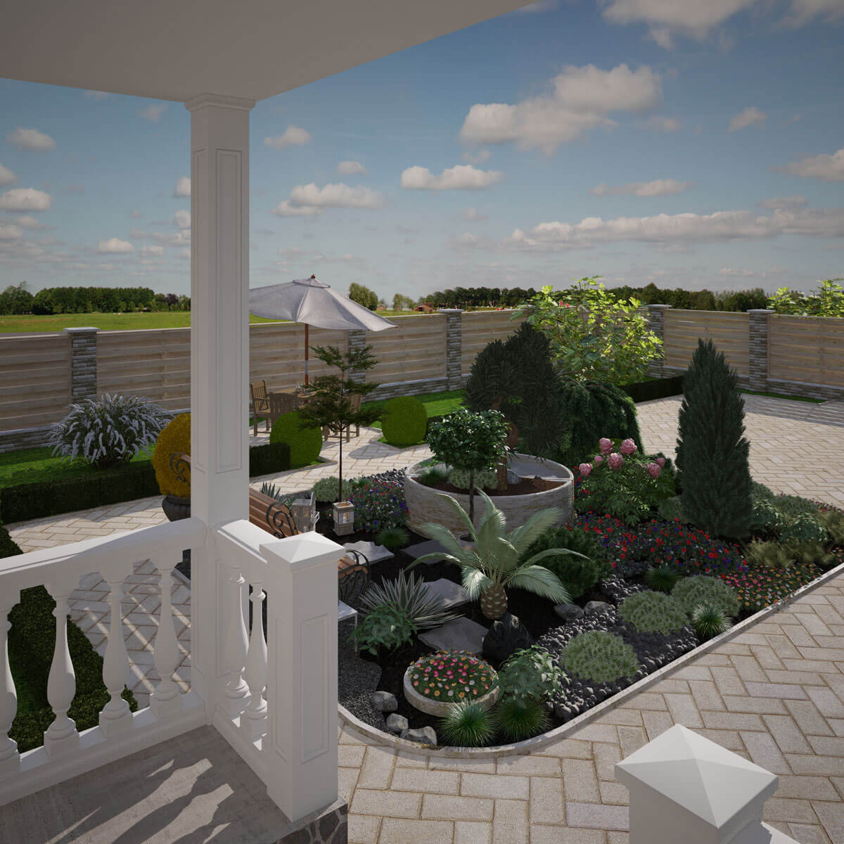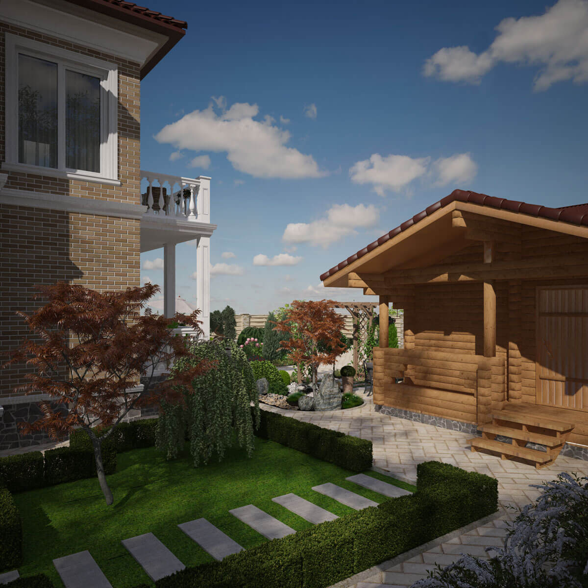 Слива Pissardii -1 шт, Хаконохлоя -6шт, Самшит вечнозеленый – 1шт, Туя «Globozа» 0.8м – 1шт, Полынь Людовика «Silver Queen» - 30шт, Пергола – Клематис – 1шт, Каменные глыбы разных размеров.