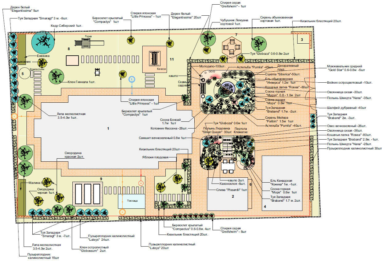 Туя Западная «Braband» 2м-3шт, Яблоня плодовая – 2шт, Кизильник блестящий – 60шт, Бересклет крылатый – 5шт, Спирея серая «Greifsheim» – 9шт, Спирея Японская «Little princess» - 2шт, Клен Гиннала – 1шт, Липа мелколистная – 2шт, Чубушник Лемуана сортовой – 1шт, Сирень обыкновенная сортовая – 1шт, Кедр Сибирский – 1шт, Дерен белый «Elegantissima» - 25шт, Туя западная «Smaragt» 3м – 16шт, Пузыреплодник калинолистный – 45шт, Пузыреплодник калинолистный «Luteys» – 44шт, Клен остролистный «Globossum» - 2шт, Смородина черная – 1шт, Смородина красная – 2шт, Крыжовник – 1шт, Малина – 5шт, Ежевика - 7шт.