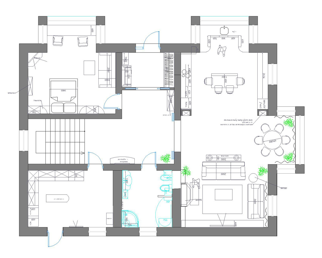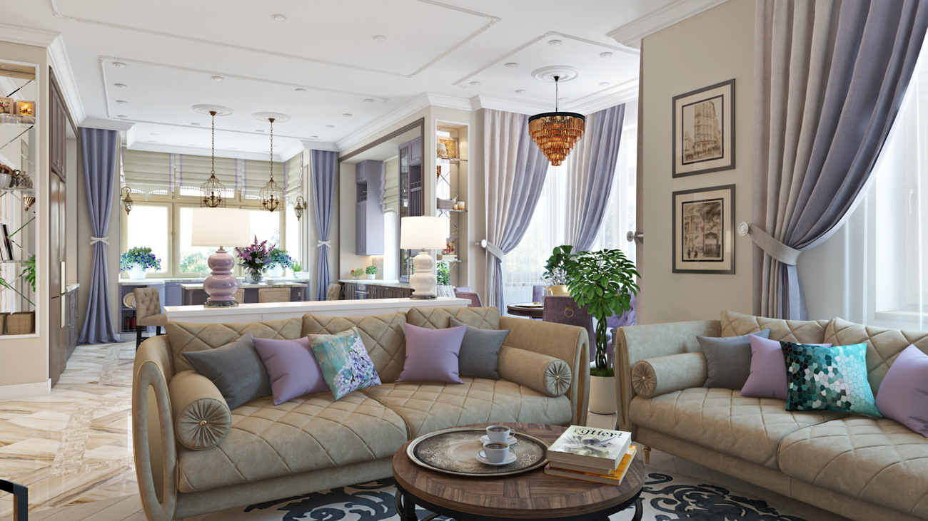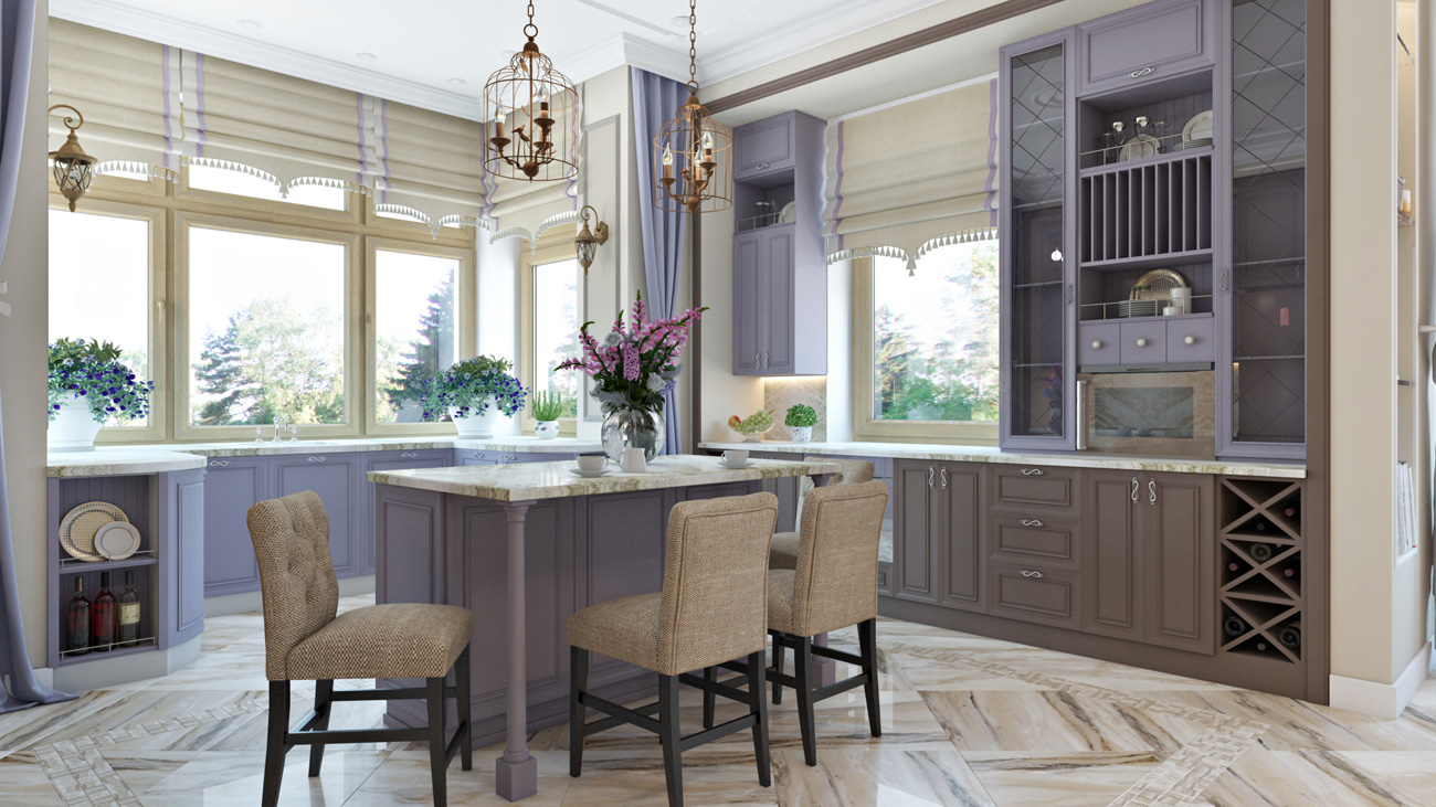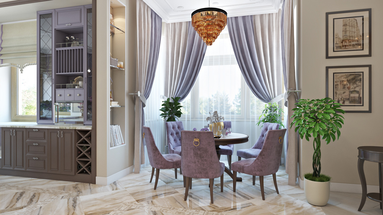 Все большое пространство первого этажа пронизано лавандовыми акцентами (стулья, шторы, лампы), атрибутами стиля прованс, с которого был начат проект и которые хорошо вписались в новую концепцию.