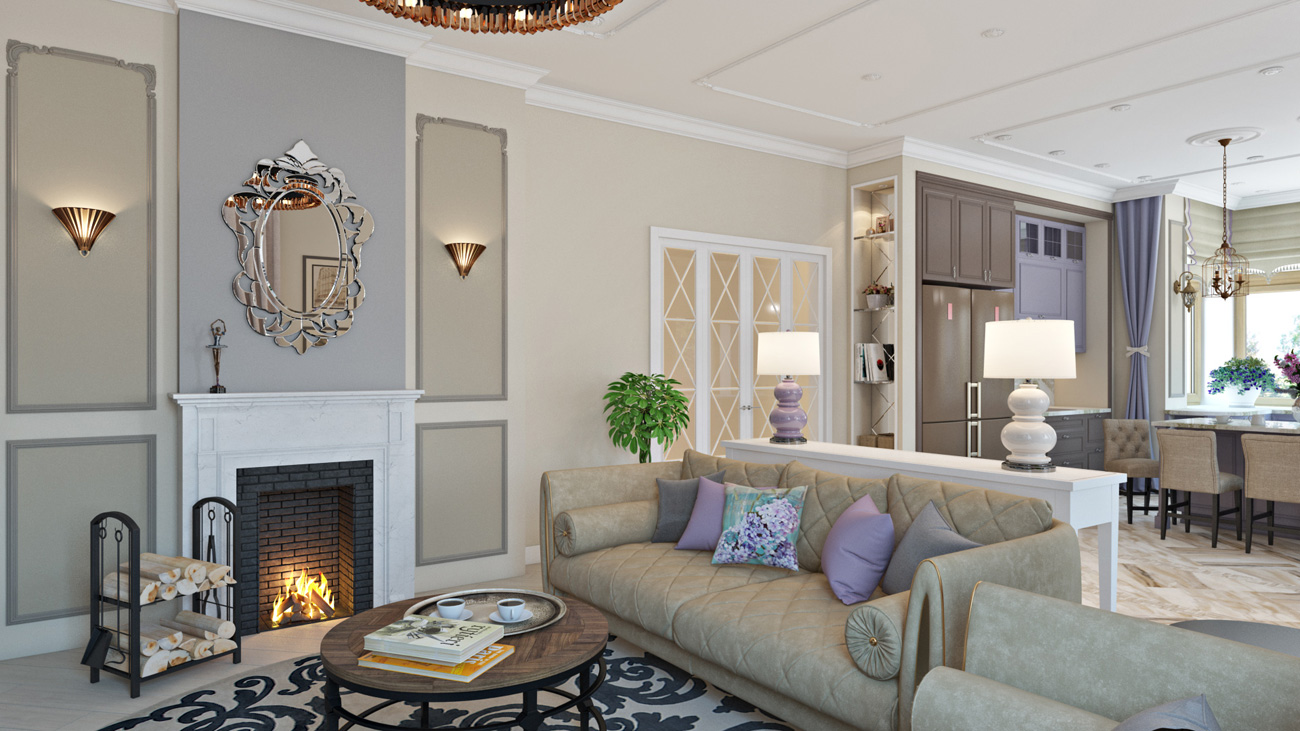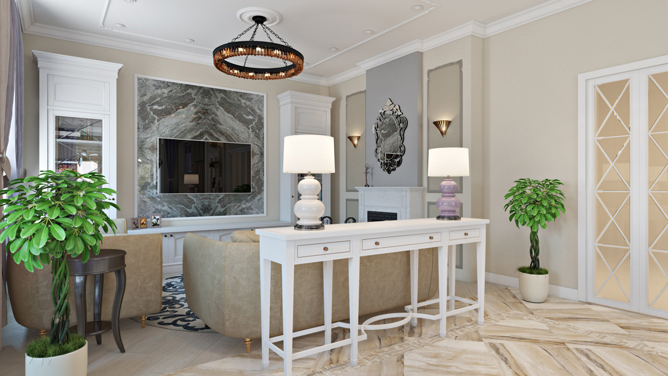 Так, в гостиной появилось большое каменное панно за телевизором, современные люстры и красивый полированный пол из камня. Такая же текстура камня повторяется на столешнице и кухонном фартуке.