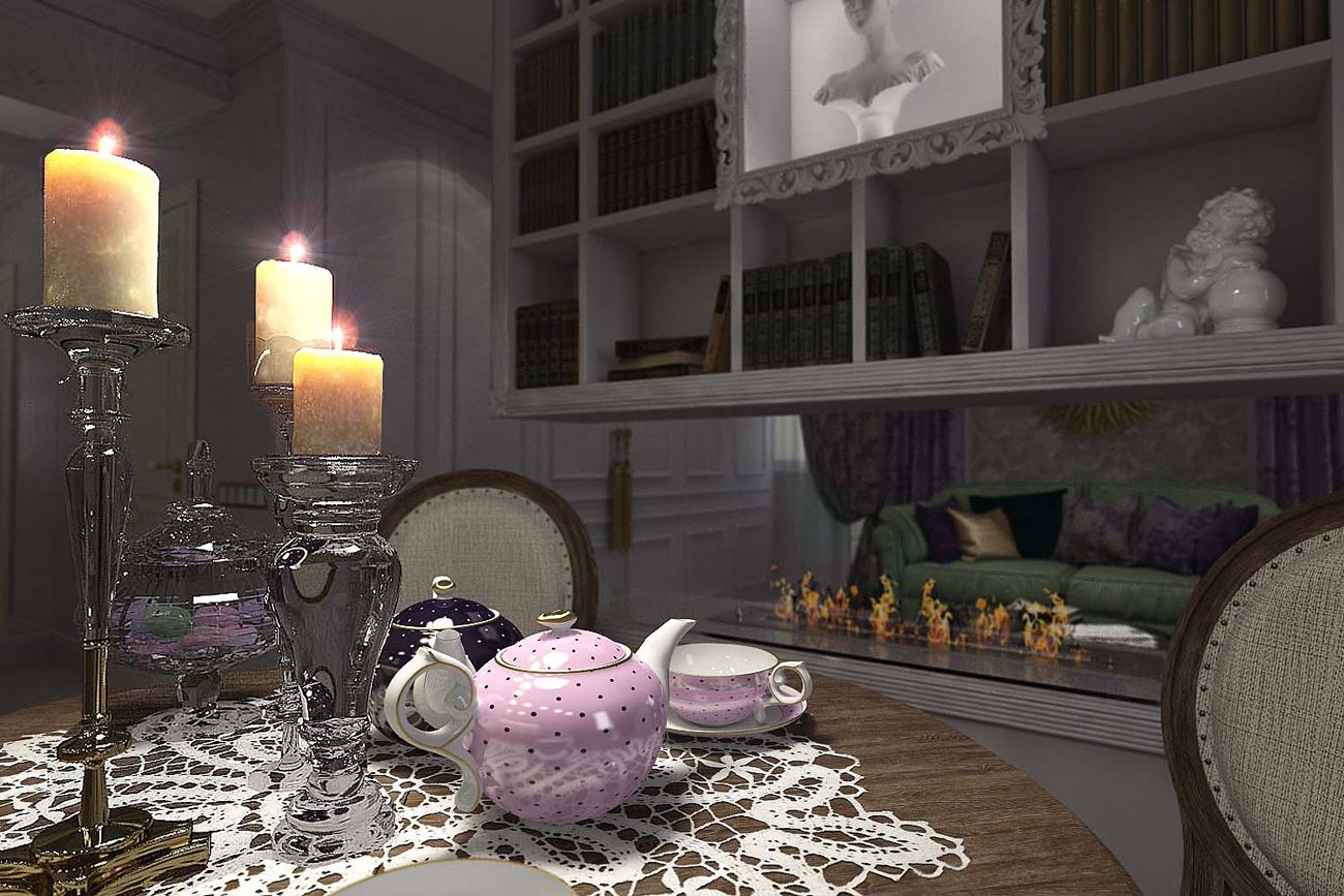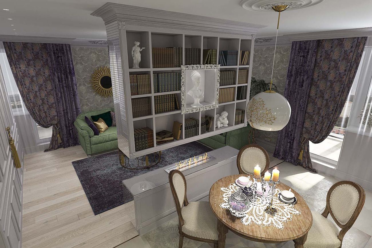 С одной стороны перегородки организован небольшой стеллаж для коллекционных кукол и книг ручной работы в кожаных переплетах. С другой стороны перегородка служит стенкой для телевизора. Таким образом, биокамин может работать сразу на две зоны: кухню и гостиную.
