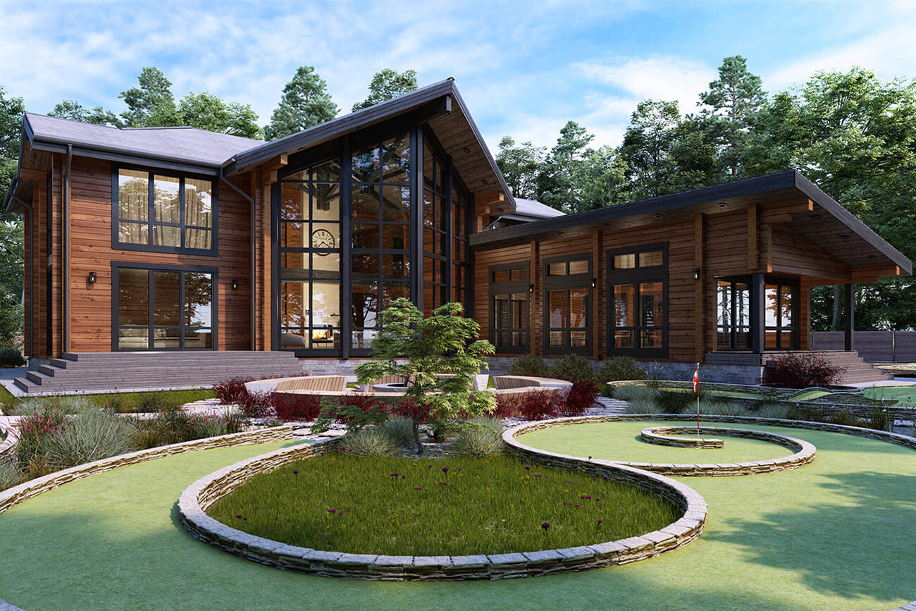Со всех сторон дом выглядит импозантно и респектабельно, он внушает спокойствие и уверенность. Слева от крыльца — вместительный гараж на два автомобиля. Из прихожей, соединенной с гардеробной, вы попадаете в огромную гостиную, залитую вторым светом, — 62 кв. м релакса, непринужденных бесед и созерцания волшебного леса за бескрайними панорамными окнами. К гостиной логично примыкает кухня — столовая, из которой устроен выход на уютное патио.