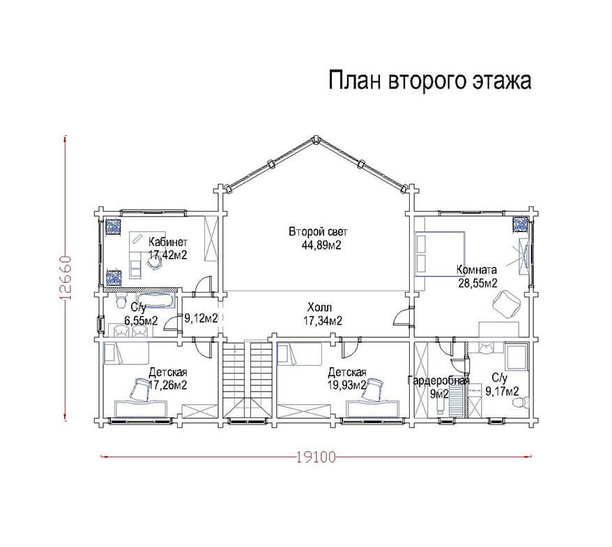 Второй этаж усадьбы — вотчина гостеприимных хозяев дома. Здесь расположены просторная взрослая и две детские спальни, а также удобный рабочий кабинет. Отсутствие перекрытия над гостиной 1-го этажа обеспечивает в ней ежедневное царство солнечного света. Да и весь дом всегда заполняется дневным светом, благодаря большой площади остекления.