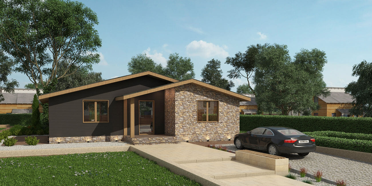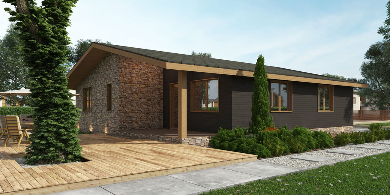 Наружная отделка — традиционное для этого стиля сочетание натуральной древесины и камня. Внутреннему оформлению эффект объема могут придать открытые потолочные балки.
