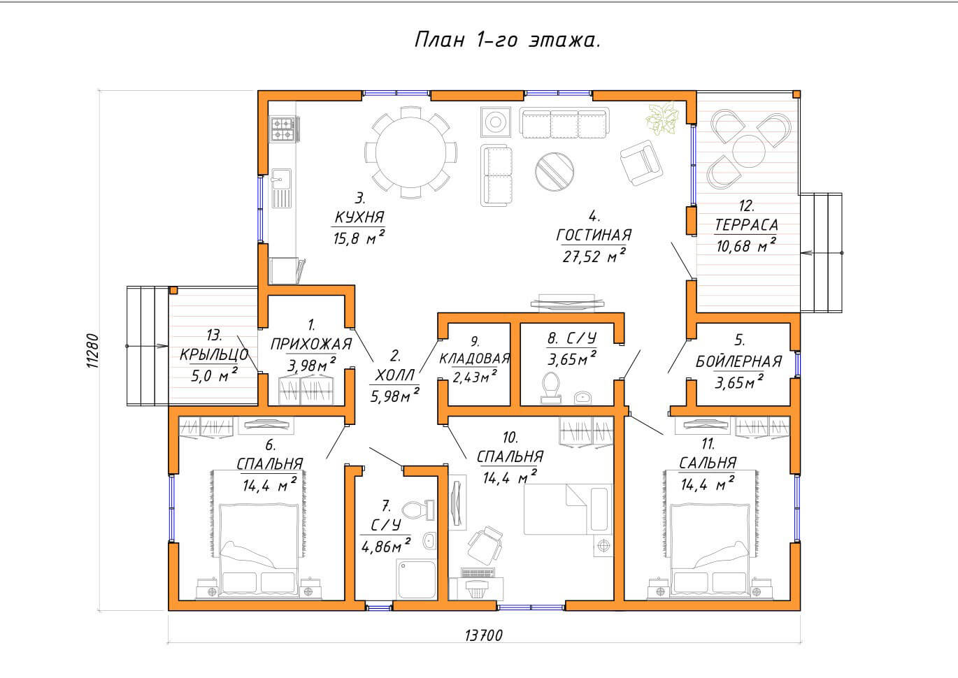 Планировка дома при относительно небольшой площади включает три спальни, просторную зону гостиной-столовой и два санузла. Дом как будто приглашает в полной мере насладиться всеми прелестями загородной жизни.