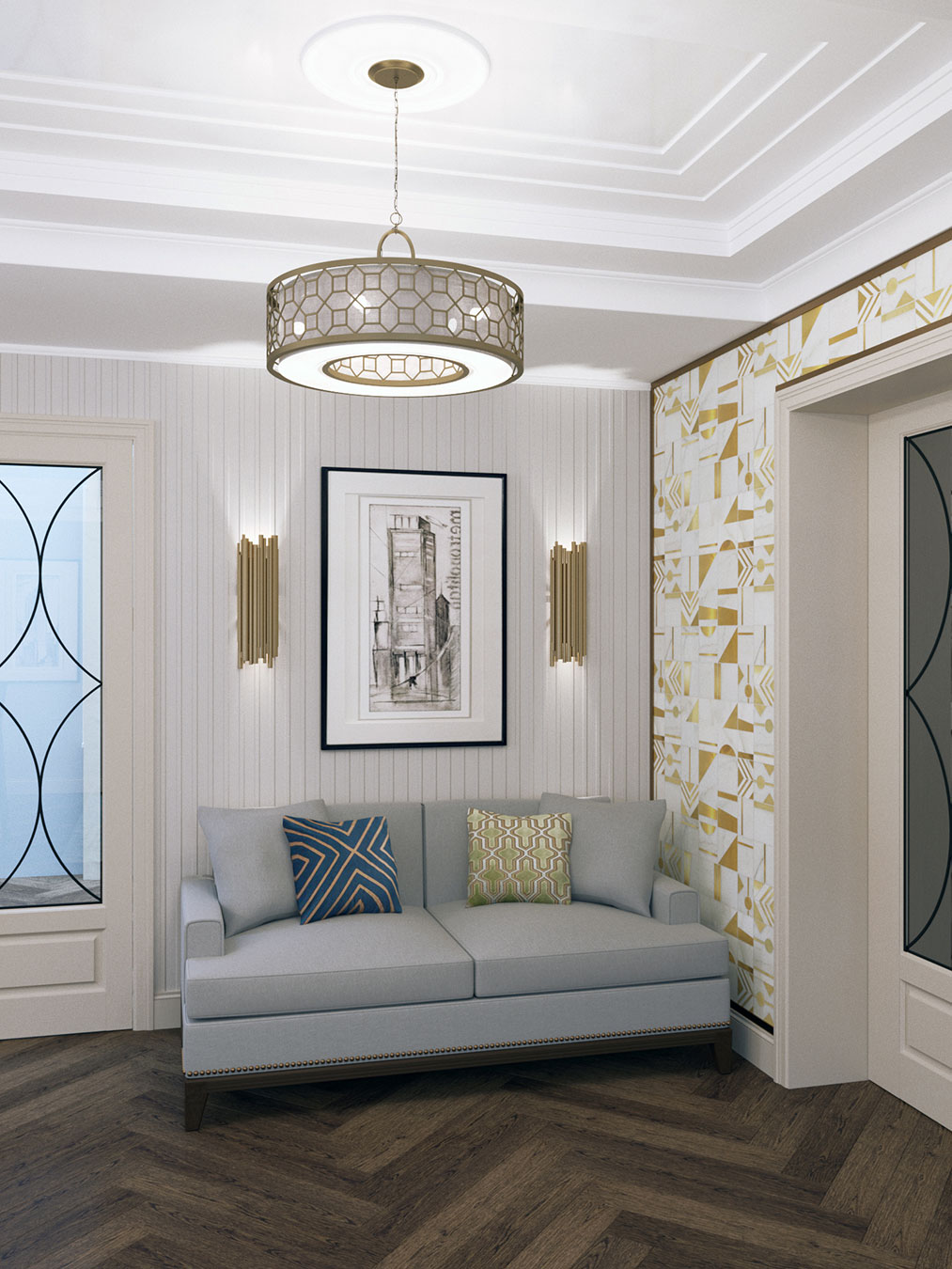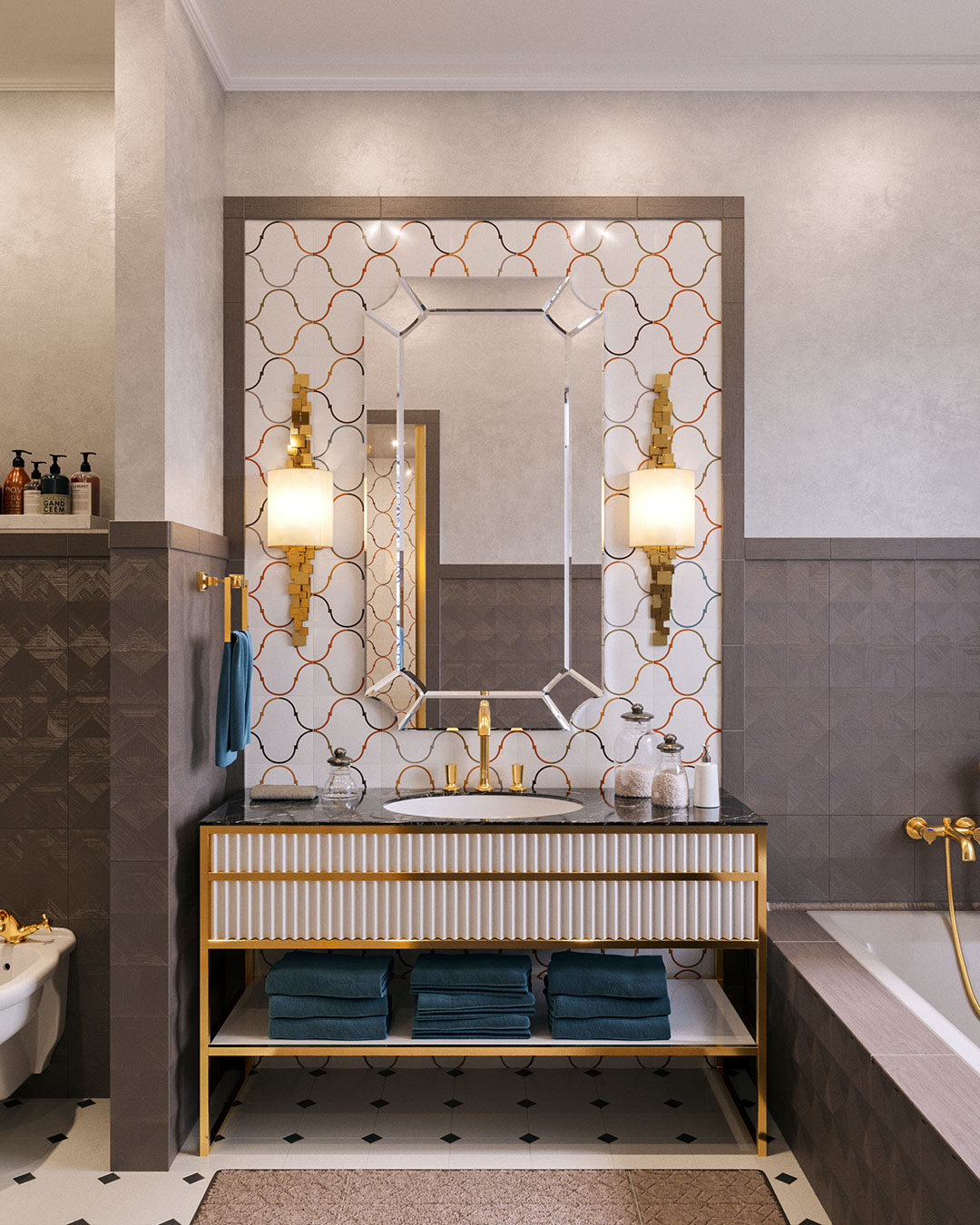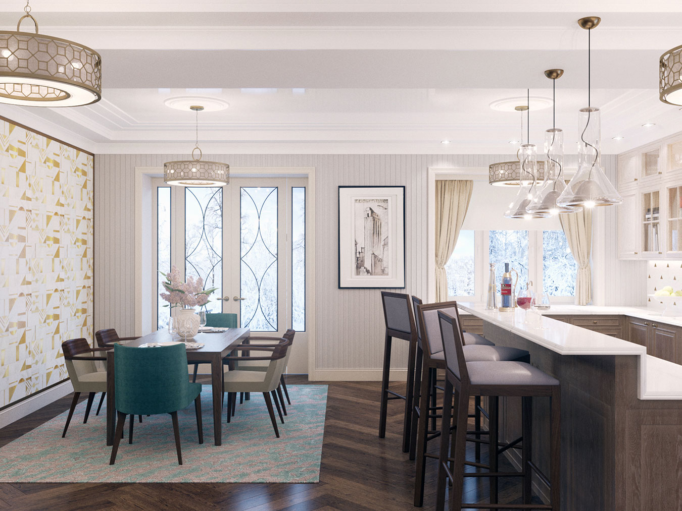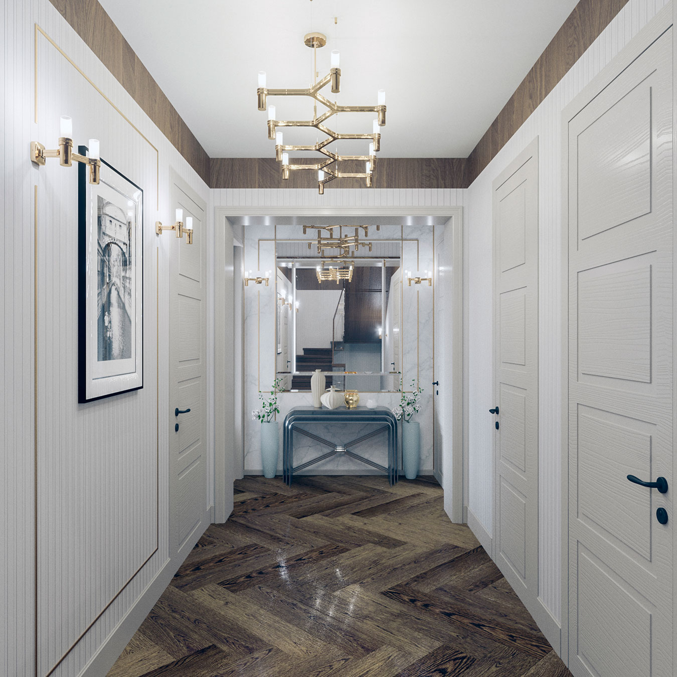 Планировочное решение отвечает всем требованиям удобства и функциональности: просторный холл, роскошные гостиная и кухня-столовая, индивидуальные спальни с санузлами и гардеробными для каждого члена семьи. В интерьере оттенки темного полированного дерева, натурального мрамора, золота и меди изящно сочетаются с современными геометрическими орнаментами, позаимствованными у стиля ар-деко. Колористическое решение — палитра сложных «припыленных» оттенков, благородно контрастирующих с темным деревом, с включением ярких акцентов.