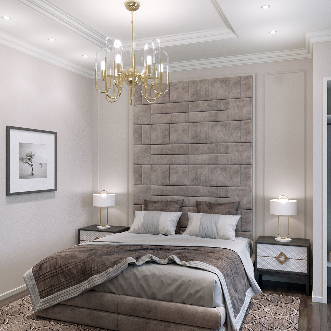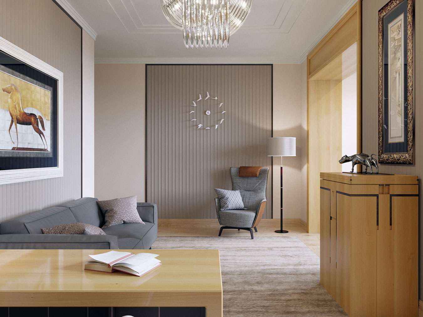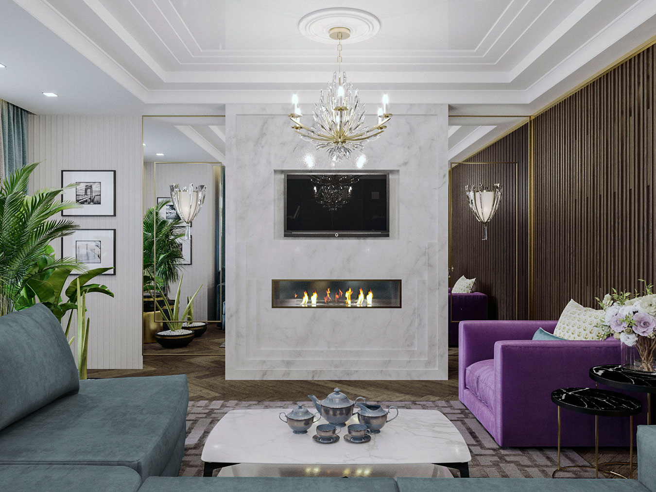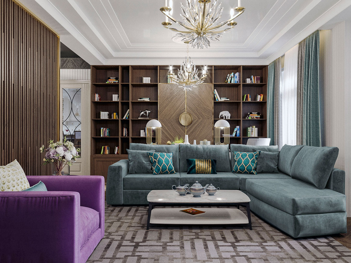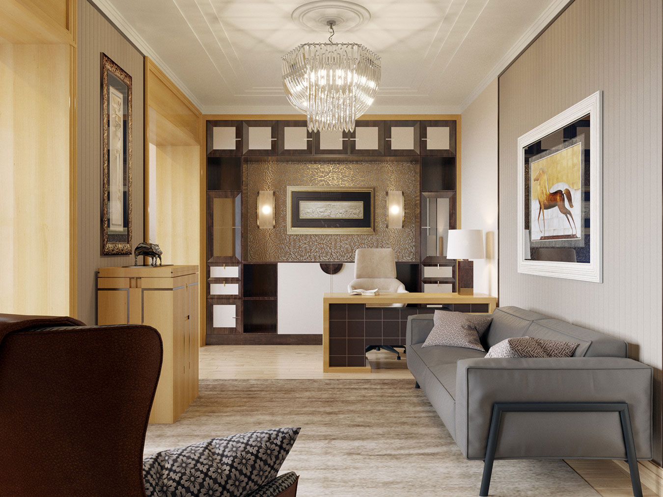 Планировочное решение отвечает всем требованиям удобства и функциональности: просторный холл, роскошные гостиная и кухня-столовая, индивидуальные спальни с санузлами и гардеробными для каждого члена семьи. В интерьере оттенки темного полированного дерева, натурального мрамора, золота и меди изящно сочетаются с современными геометрическими орнаментами, позаимствованными у стиля ар-деко. Колористическое решение — палитра сложных «припыленных» оттенков, благородно контрастирующих с темным деревом, с включением ярких акцентов.