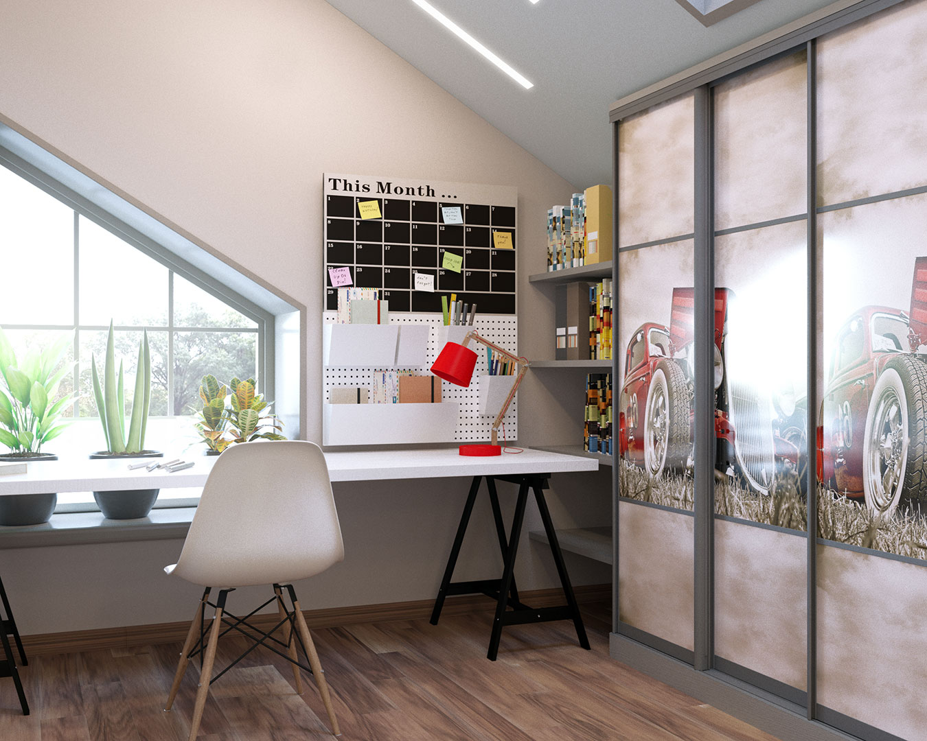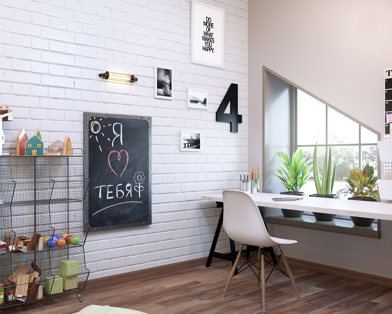 Мансардный этаж оформлен кардинально противоположно — в стиле лофт — и предназначен для многочисленного подрастающего поколения. Здесь все помещения имеют свой образ, они яркие, творческие — как и само детство! Но, несмотря на индивидуальность оформления «взрослой» и «детской» зон, чувствуется сплоченность всего большого семейства.