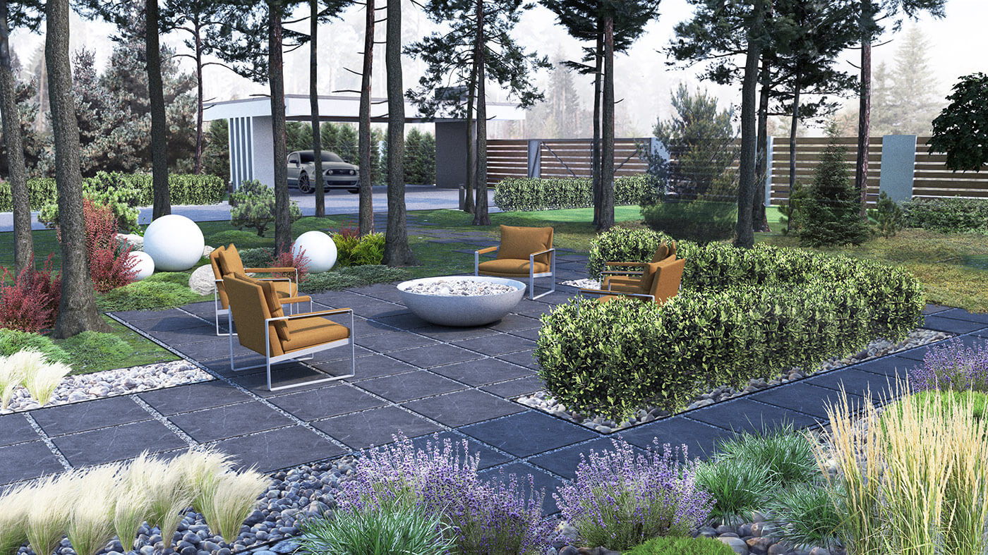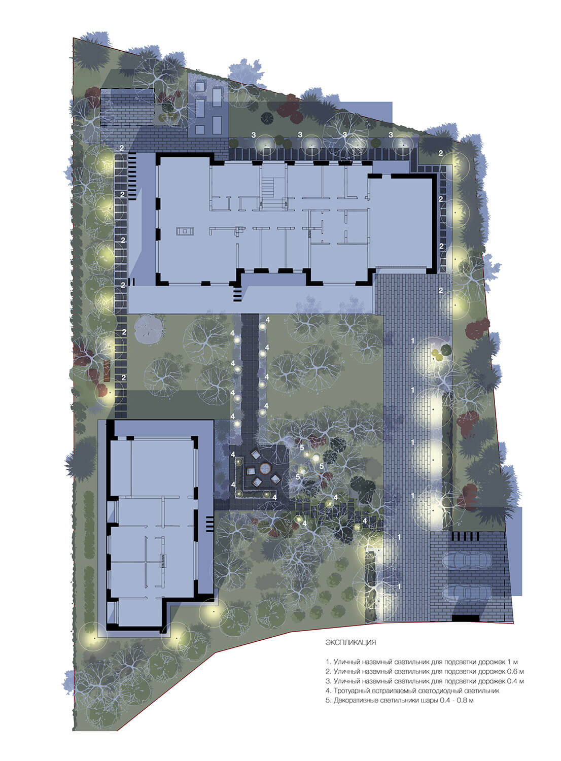 Лаконичные геометричные дорожки вторят архитектуре, связывая точки притяжения и зонируя территорию.