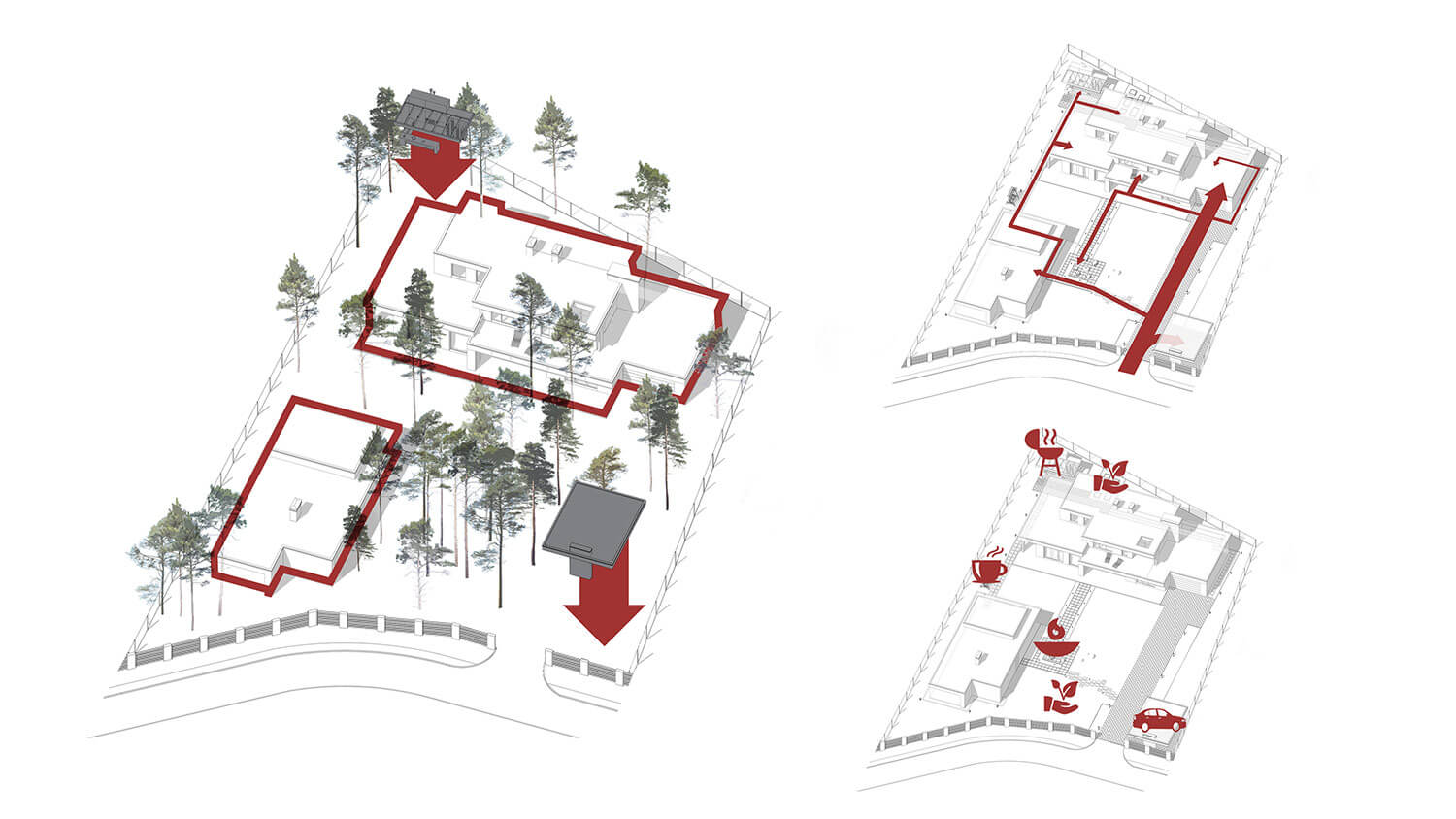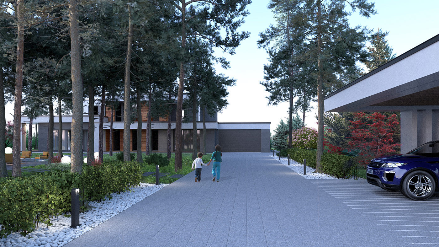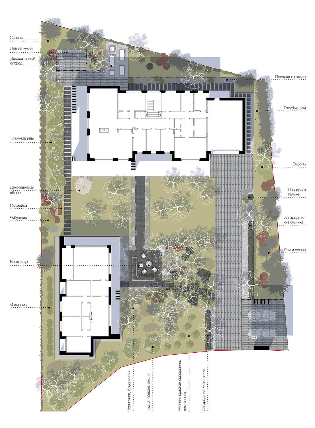 На участке площадью 0,3 га две постройки — главный и гостевой дома. Основное требование к проектированию — максимальное сохранение существующих сосен. В соответствии с желанием заказчика были размещены навес для машин и летняя кухня.