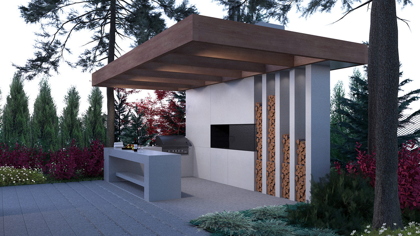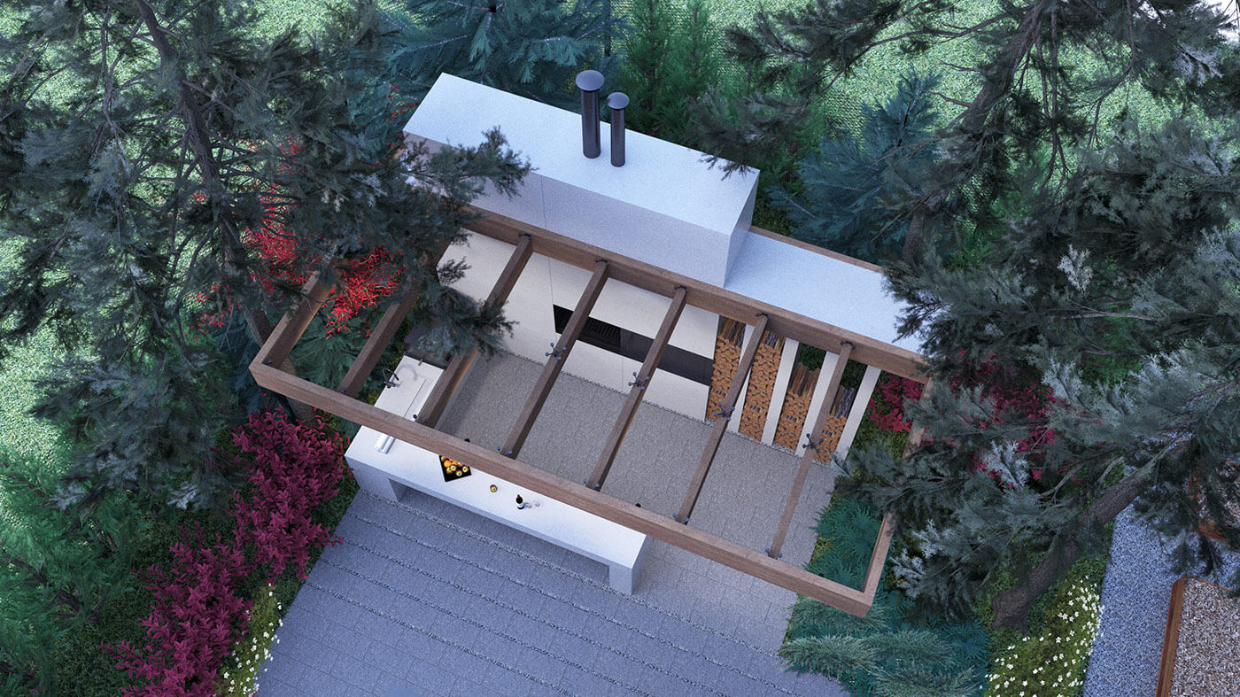 Летняя кухня расположена за главным домом. Ее вид соответствует архитектуре зданий: простая геометричная форма, основными материалами для которой стали бетон и дерево. Архитектурный прием — несколько плотно стоящих колонн, фигурирующих на фасадах жилых домов, нашел свое применение в виде дровяника. Главный элемент — большая печь, также есть гриль и раковина с подведенным водопроводом. Барная стойка из монолитного бетона разделяет пространство кухни и сада. Мощная консольная конструкция навеса визуально облегчается стеклянной кровлей.