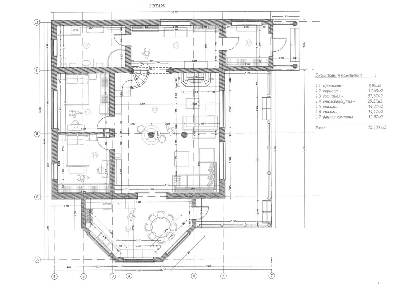 Усадьба построена по принципу функционального зонирования: разделяется на приватную (2-й этаж) и общественную зону (1-й этаж). На первом этаже расположены большая терраса, входная группа, гостиная, кухня-столовая, две гостевые спальни, совмещенный санузел. Общая площадь первого этажа — 156 м2.