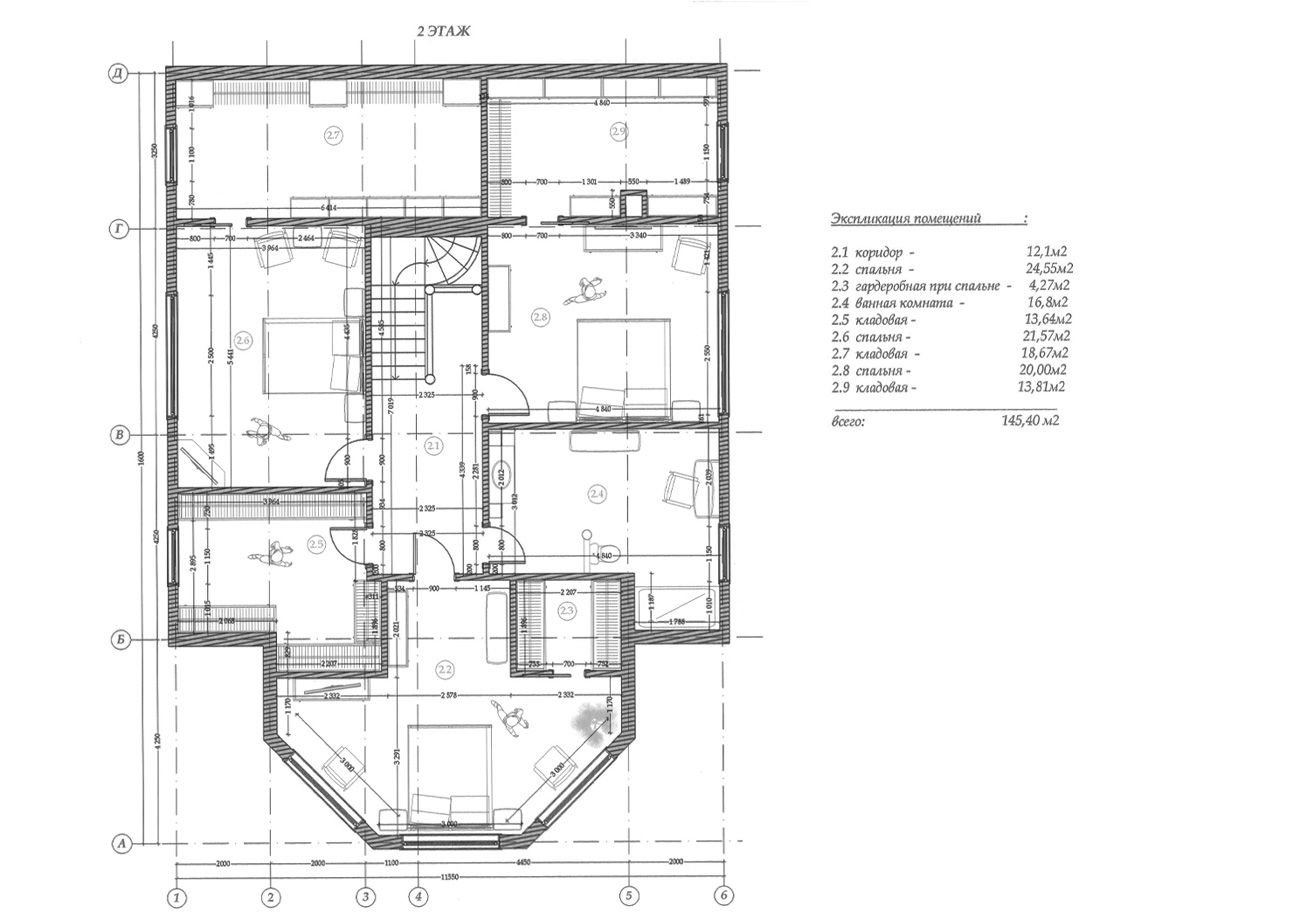На втором этаже находятся три спальни с гардеробами, совмещенный санузел. Общая площадь 2 этажа — 145,4 м2. Общая площадь дома — 301,4 м2.