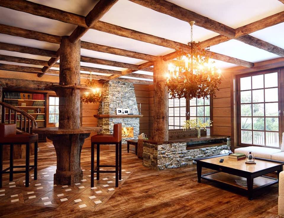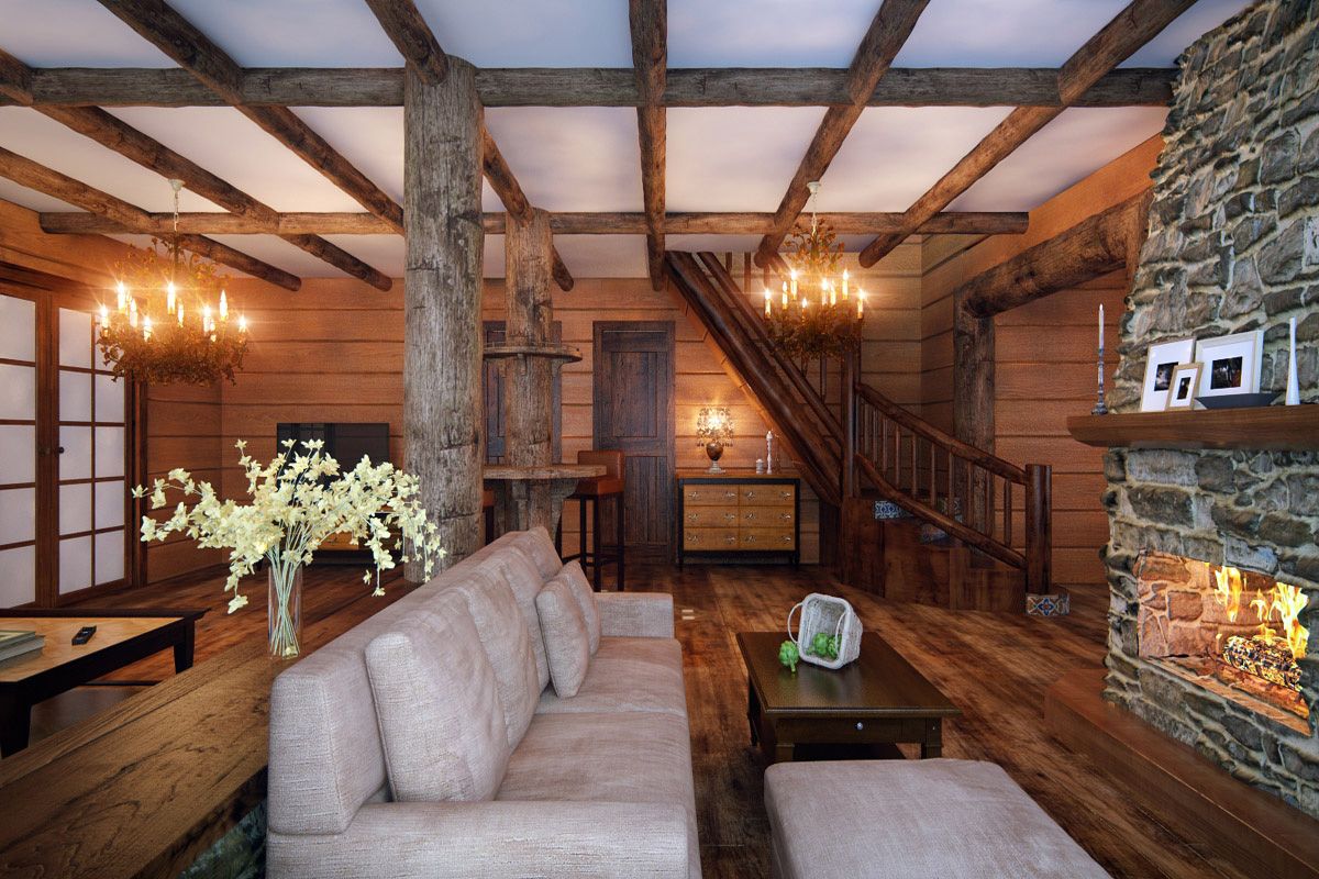 Интерьер диктует использование бревен. В гостиной опорный столб становиться барной стойкой. Смысловым центром дома является большой камин, обработанный грубым камнем, вокруг которого собирается вся семья.
