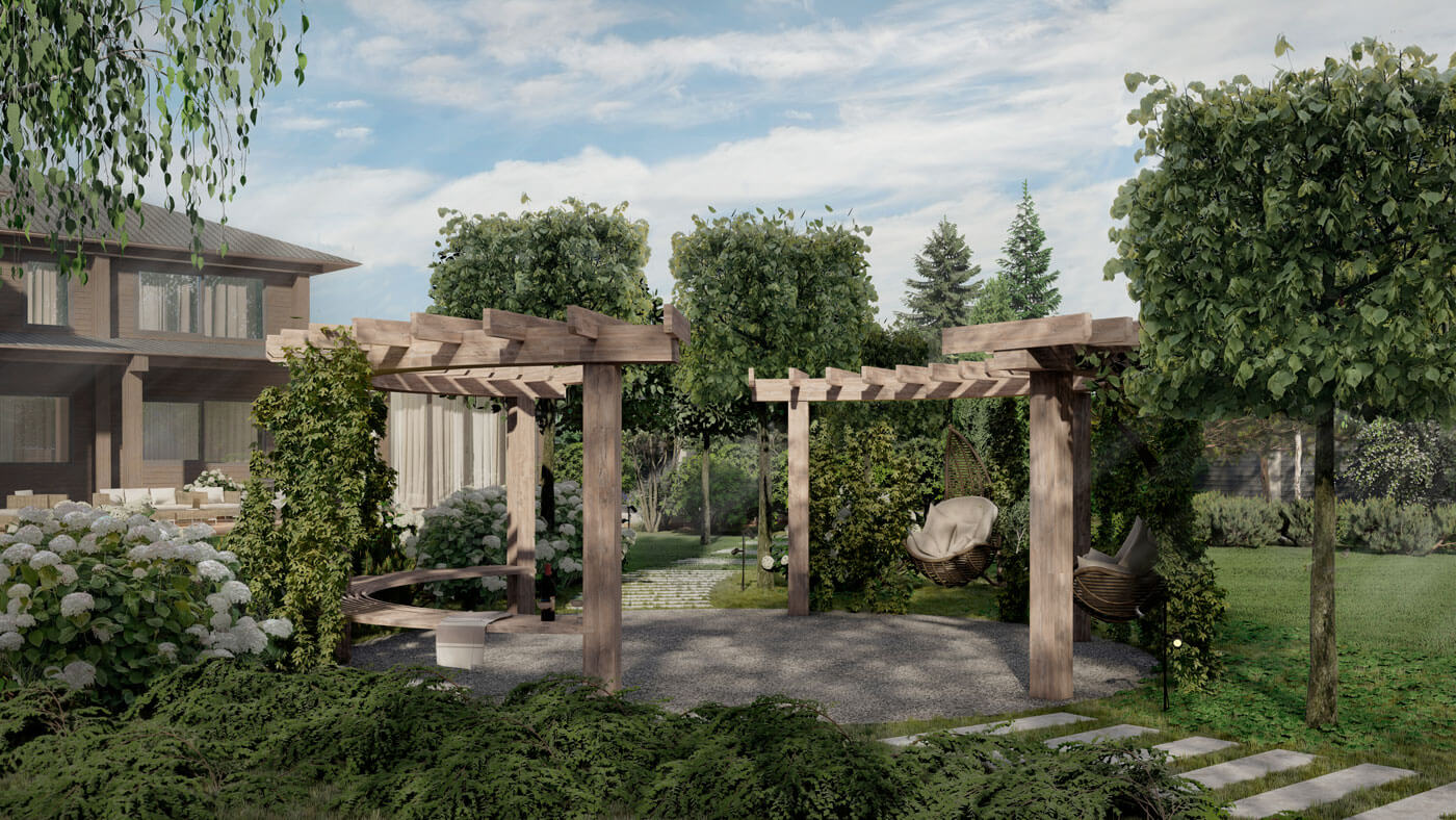 По периметру участка высажены многоярусные посадки для создания камерности и приватности, которые скрывают, территорию от соседей и дороги.