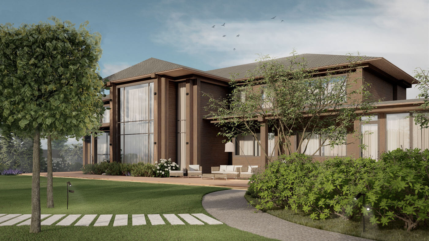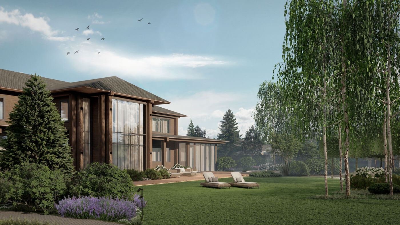 Основная концепция проекта – это гармоничная интеграция в существующую лесную зону новых элементов ландшафта. Посадки и зоны вплетены в существующую структуру леса таким образом, чтобы создать атмосферу изобилия и изысканности.