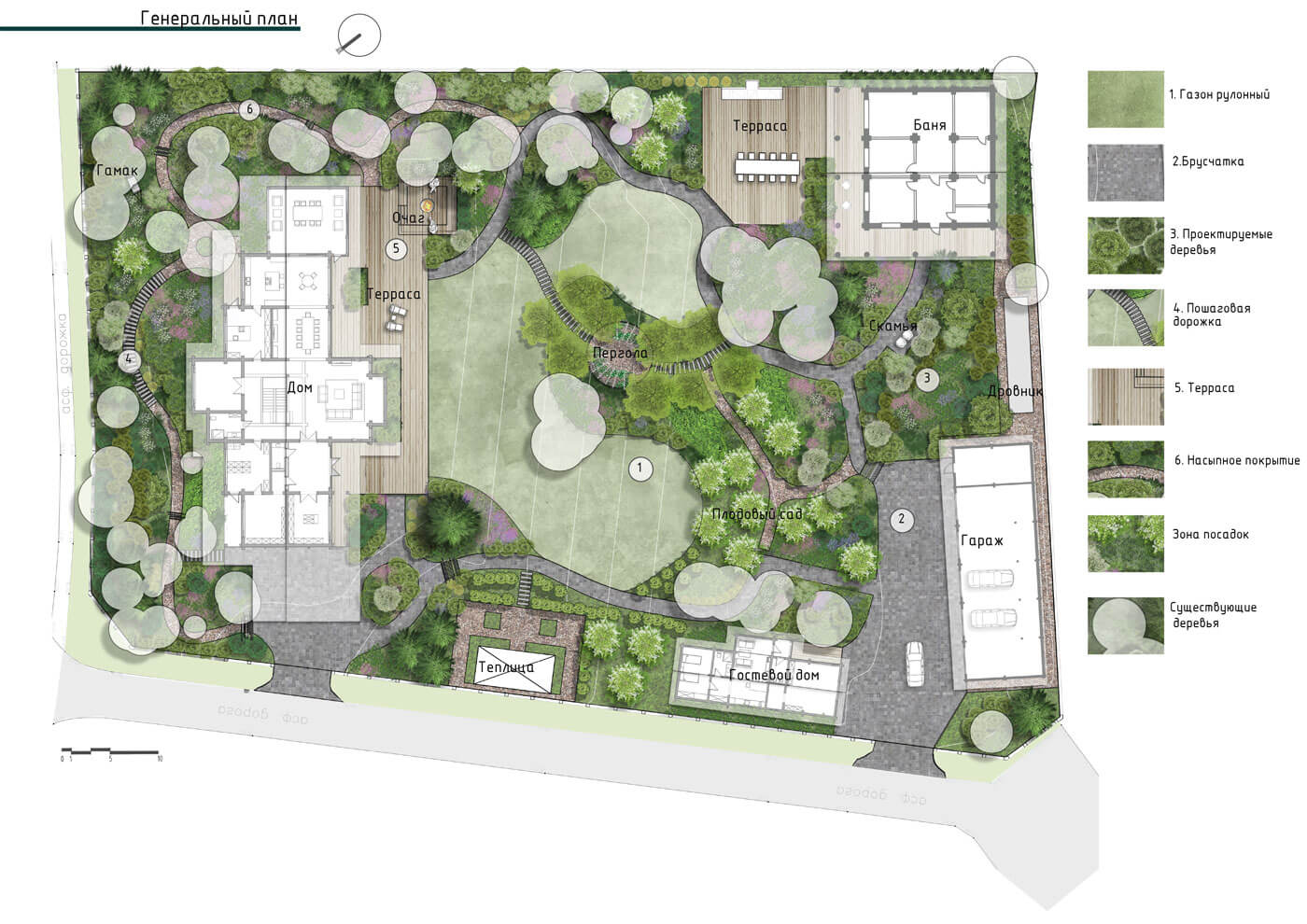 Участок очень насыщен разнообразными зонами и сценариями их использования. На территории участка разместили различные зоны: плодовый сад, огород с теплицей, пергола для уединения, просторный гараж для техники, дом с большой террасой и встроенным очагом, баня с зоной мангала, гостевой дом, а также зона для уединённой прогулки за домом.
