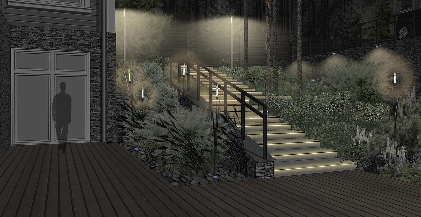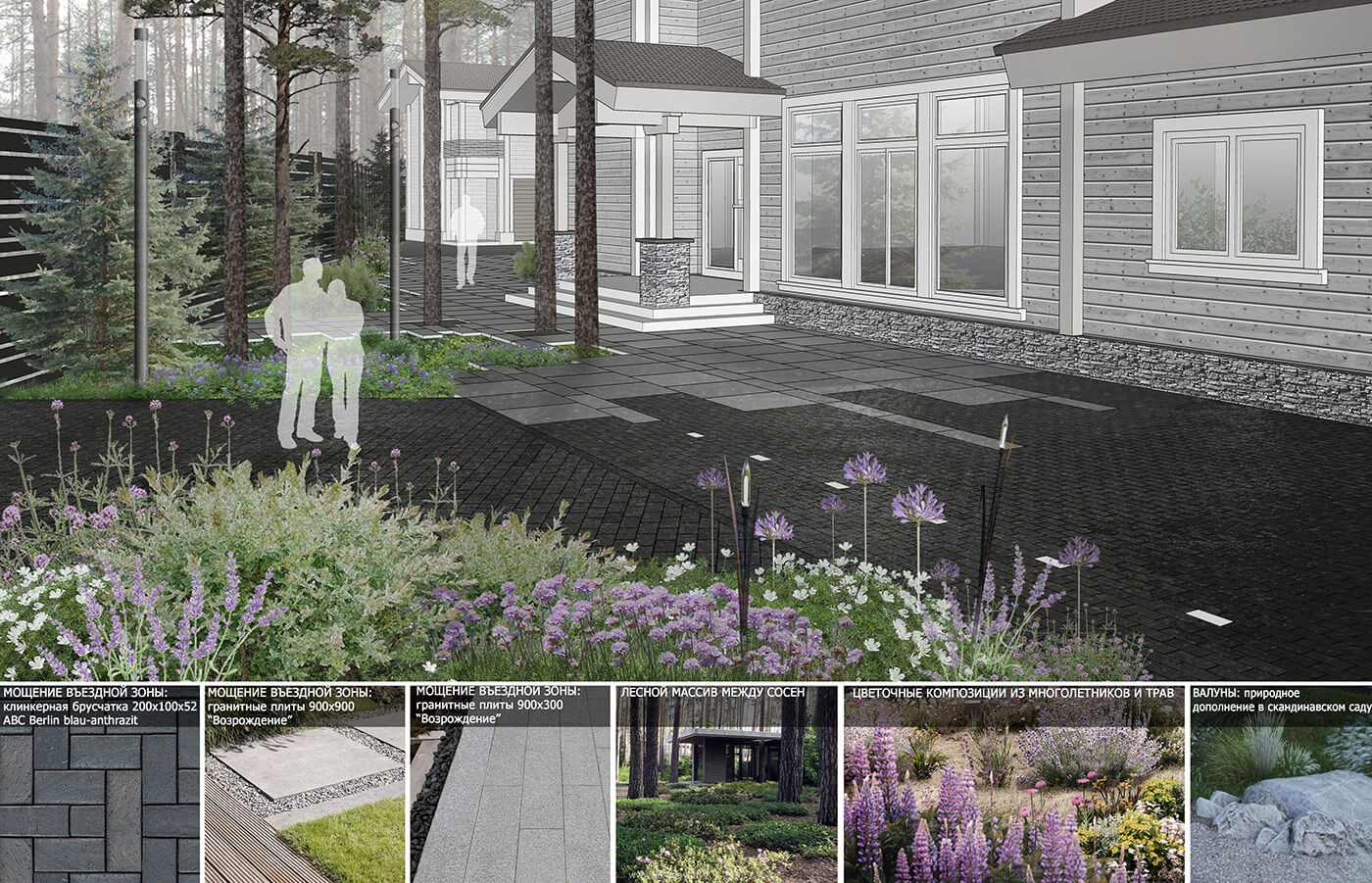 Участок проектирования находится на севере Ленинградской области и окружен лесным массивом, поэтому главной задачей было сохранение естественного ландшафта, плавное слияние благоустройства с природой.