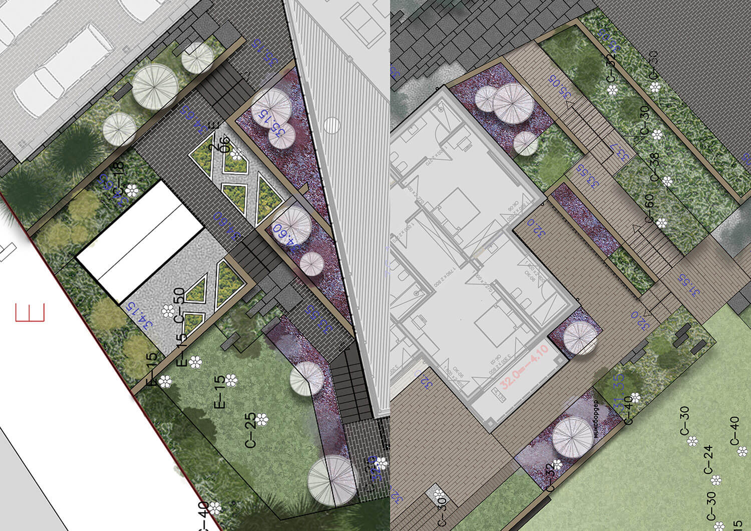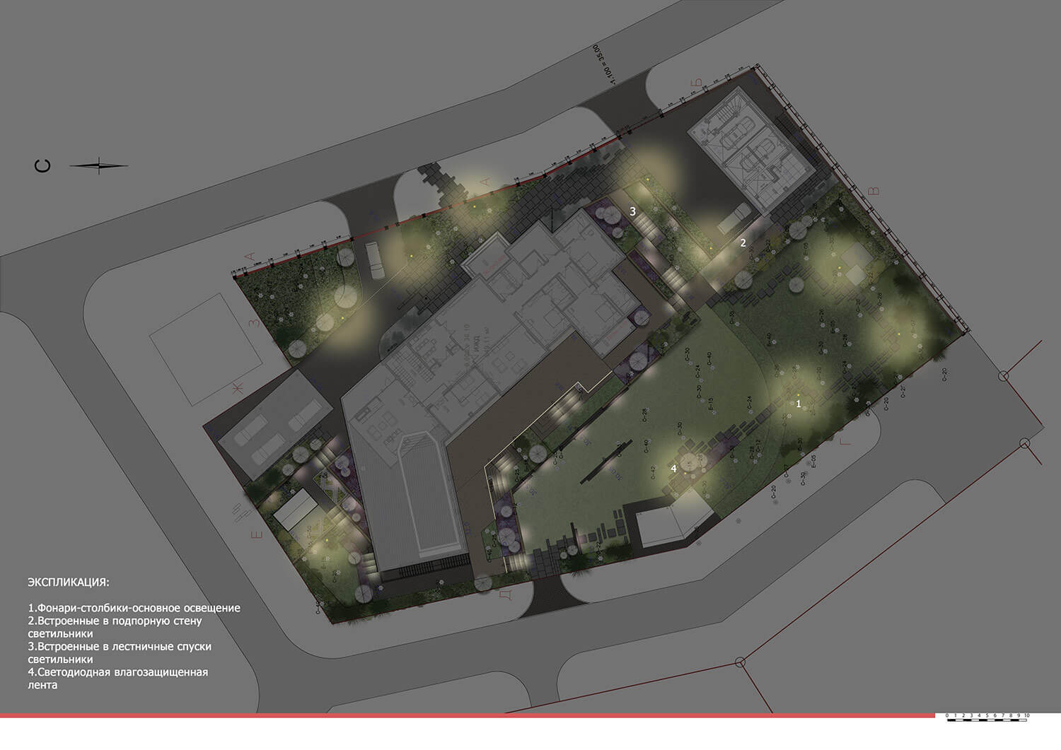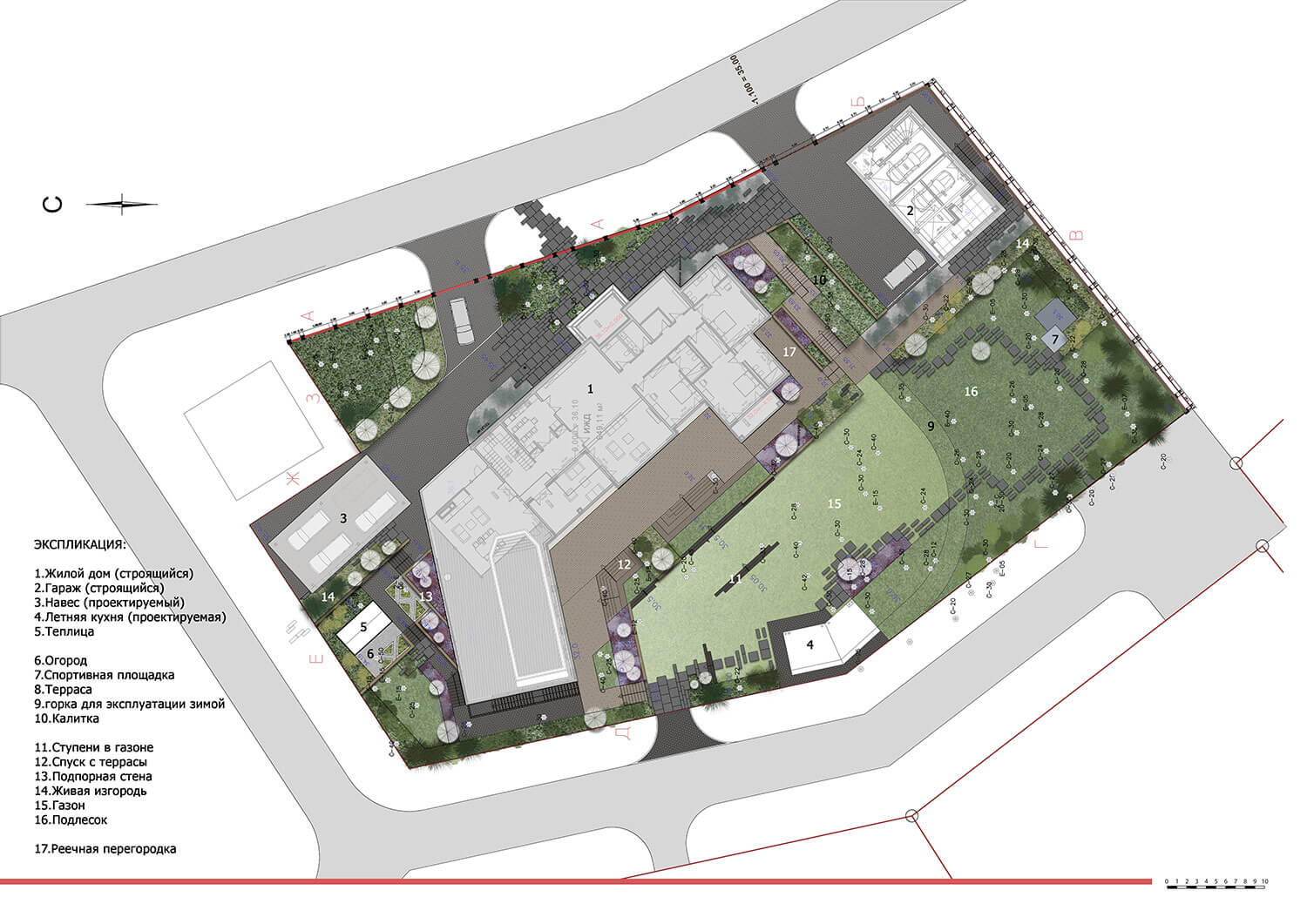 Предусмотрено несколько функциональных зон: въездная-парковочная, огородная с плодовым садом, зона летней кухни и тихого отдыха, спортивная площадка.