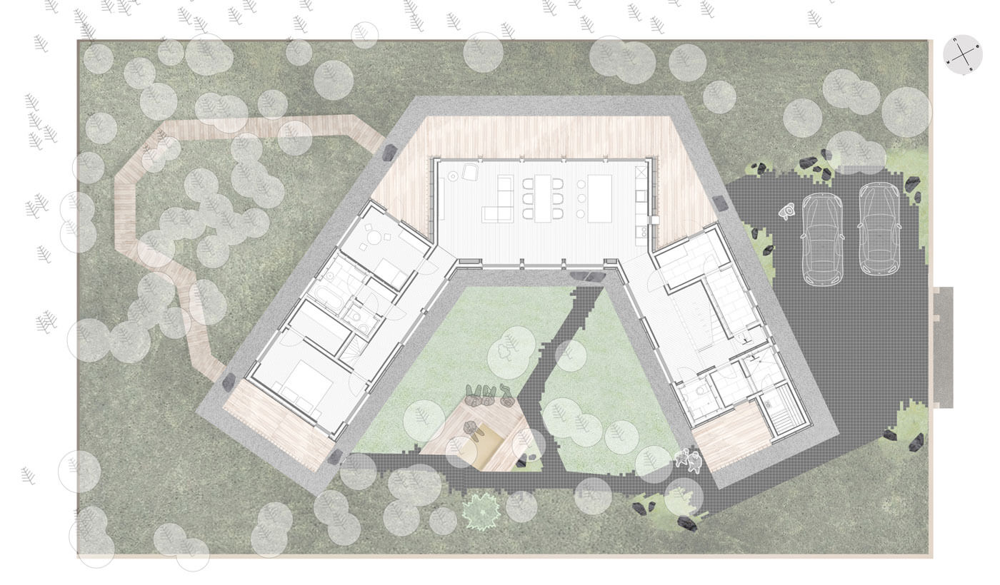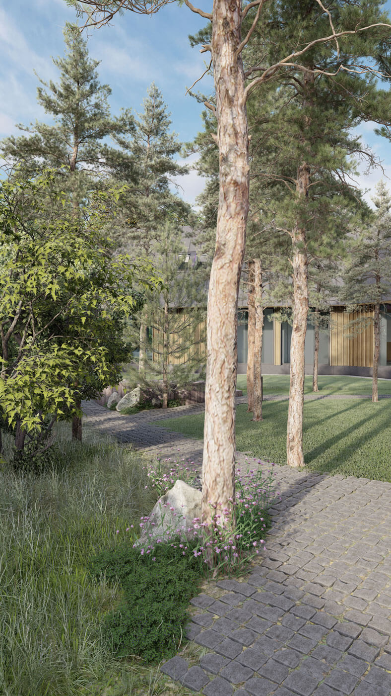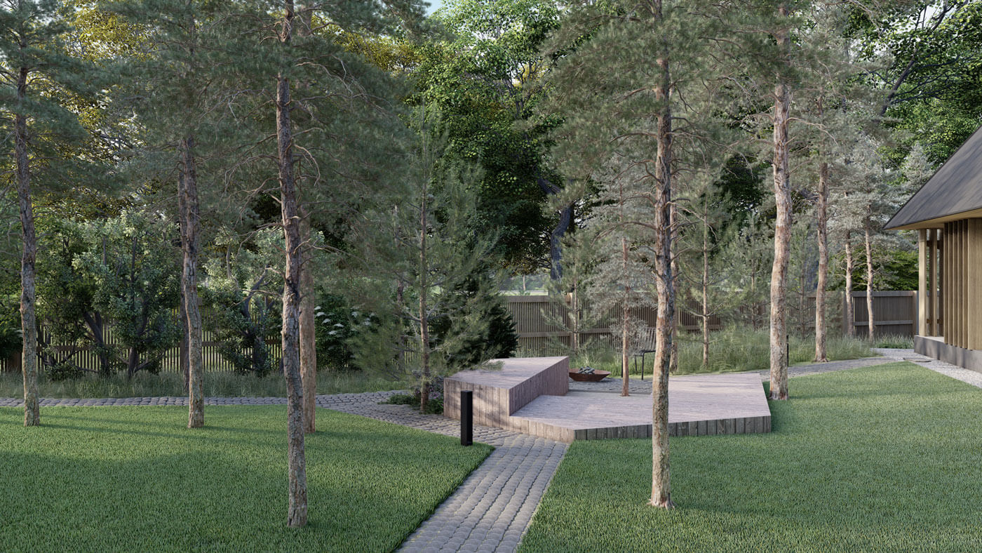 Участок расположен в лесной зоне с большим количеством существующих насаждений и естественным покровом – все это необходимо было сохранить. Рельеф равномерный, без существенных перепадов.