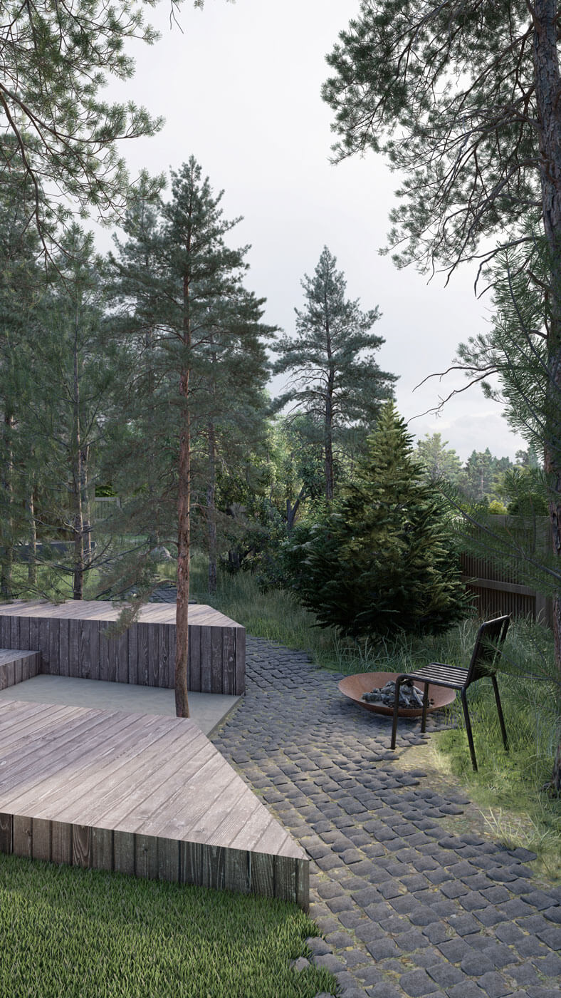 Аскетичность и минимализм в смеси с природой Карелии – так можно охарактеризовать этот проект. Как и дом, участок мы поделили на три части: парадную, лесную и внутренний двор.