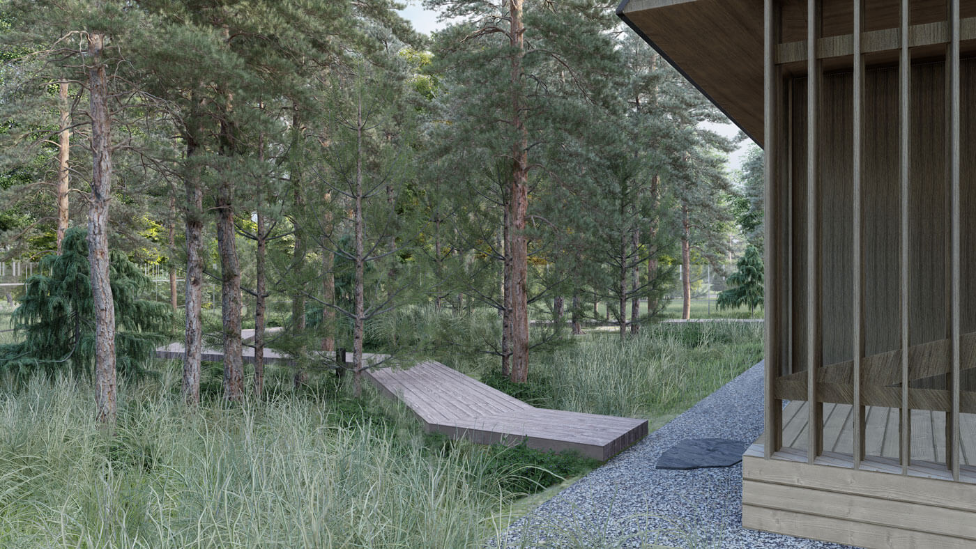 В зоне леса вмешательство было минимальным: мы проложили прогулочный настил и дополнили существующий растительный покров. Чтобы не повредить лесную подстилку, настил приподнят на сваи.