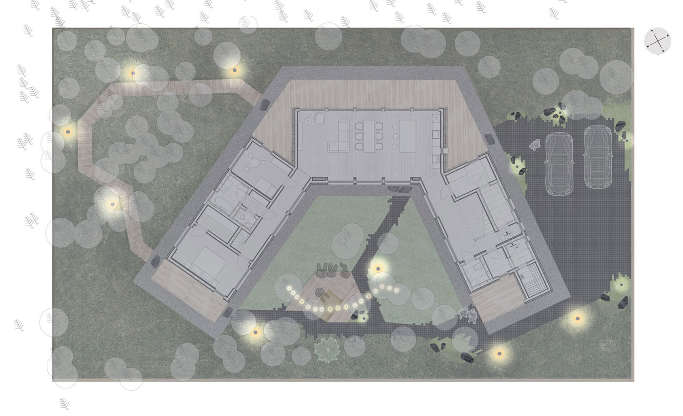 Световое наполнение также минималистично. Несколько прожекторов спрятаны между валунов в зоне парковки, функциональные светильники-столбики вдоль настила и гирлянда подчеркивает зону очага.