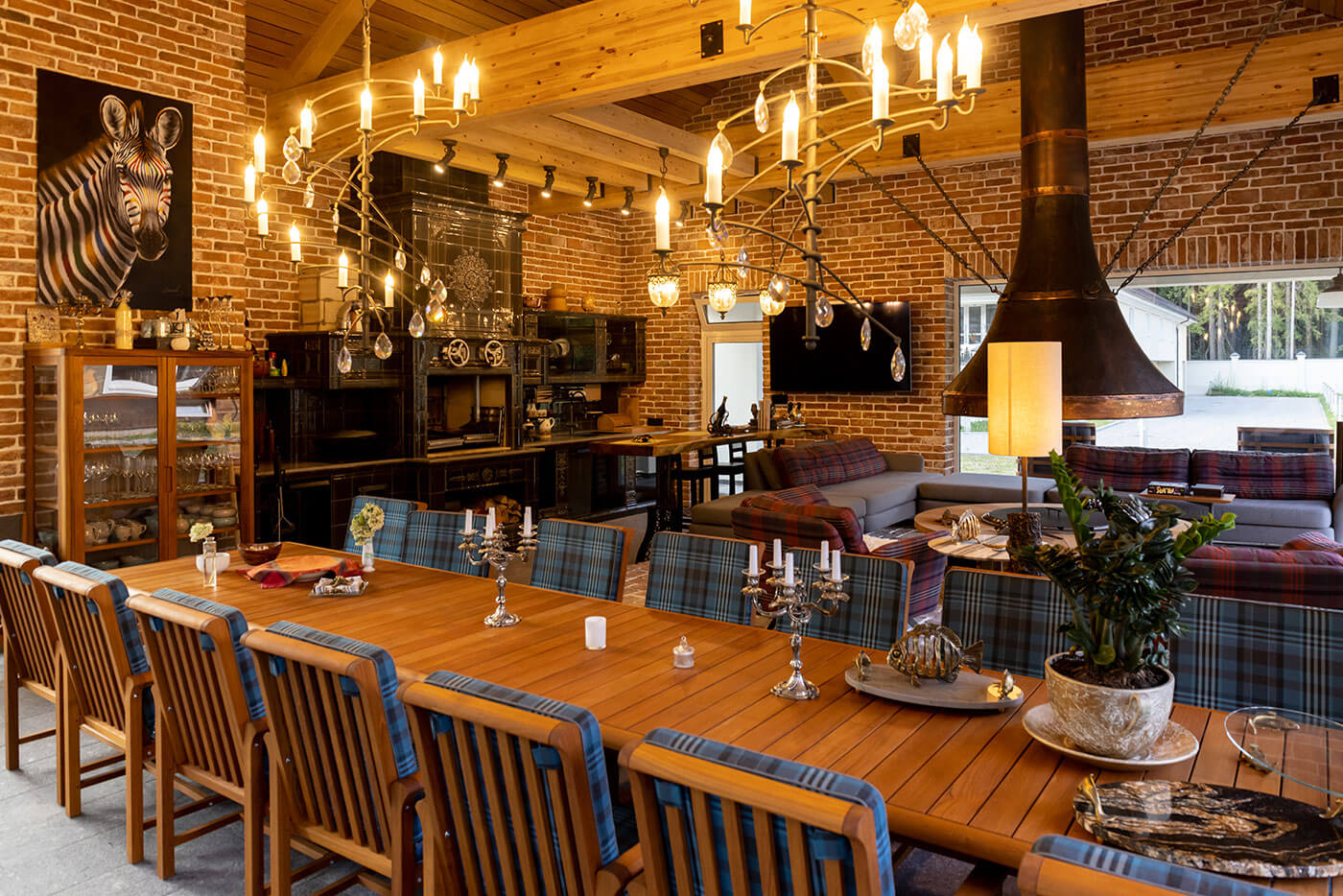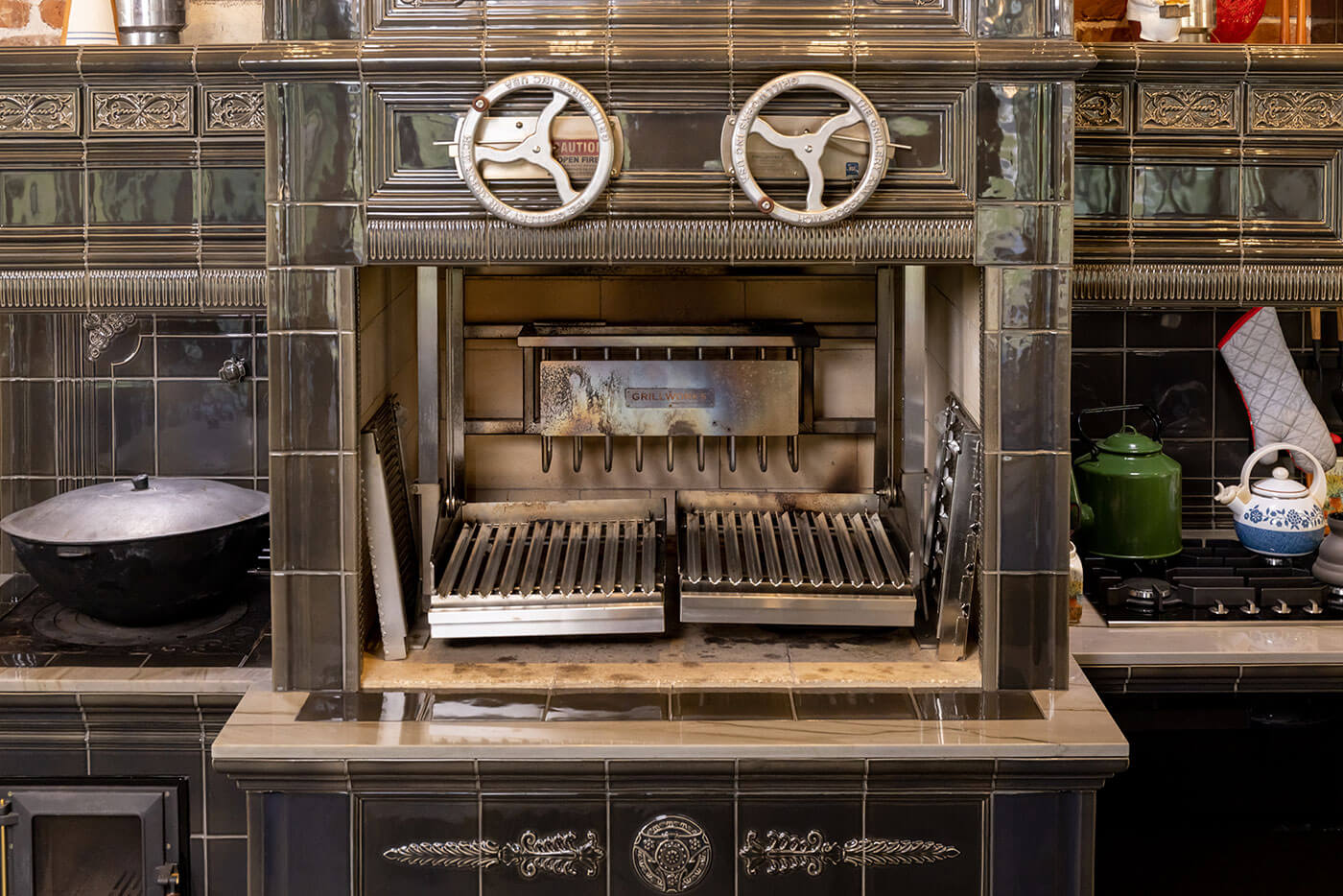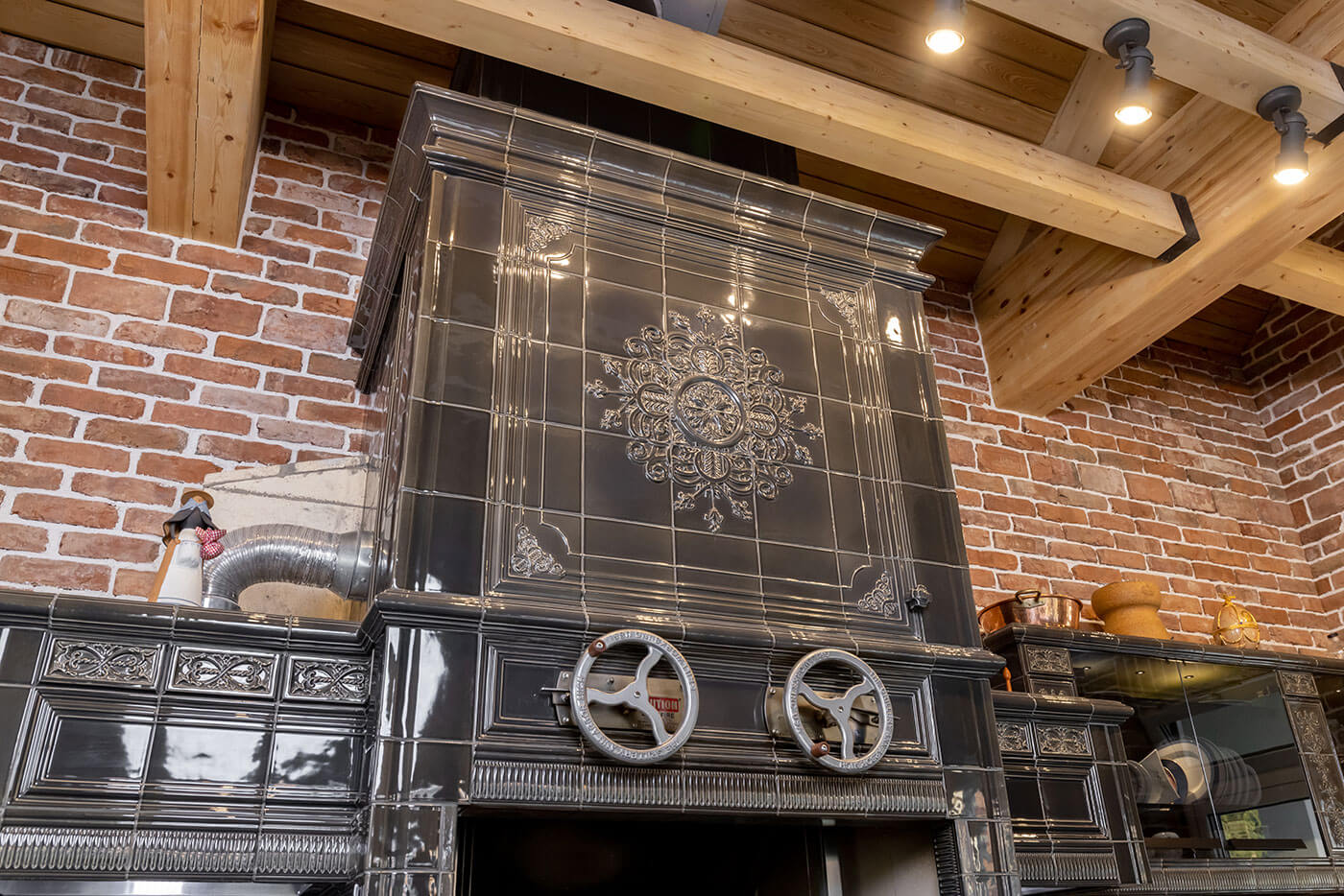 В кухне применен ряд технических решений по организации дымоотведения. На каждом дымовом канале мы поставили шиберные задвижки, чтобы блокировать поступление холодного воздуха в зимний период. Кроме того, установлены вытяжные зонты над варочными поверхностями с канальными жаропрочными вентиляторами.