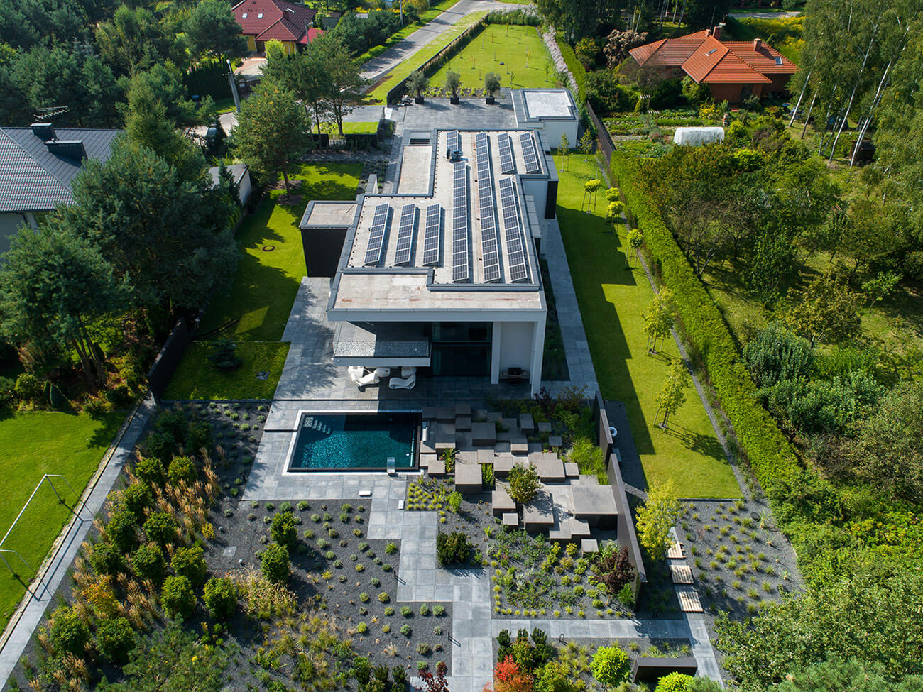 В инженерной системе здания использованы энергосберегающие технологии. На крыше установлены солнечные батареи, отопление дома запроектировано на базе теплового насоса, и это делает проект частично автономным.