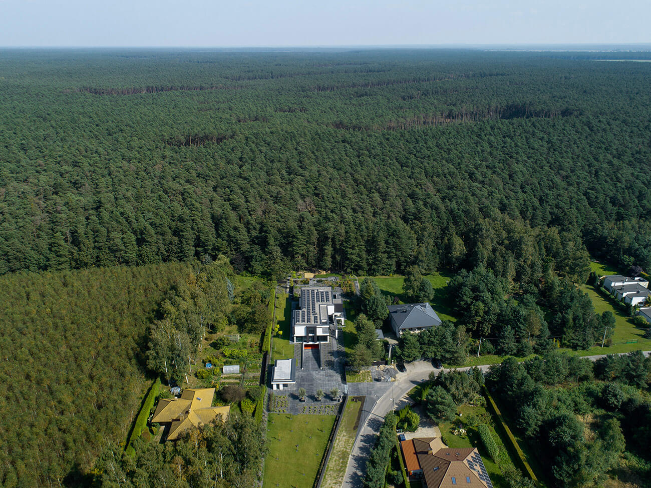 Большая площадь остекления создаёт впечатление единения с природой — ландшафт буквально перетекает в дом. Второй план «растительной сцены» составляет естественный лес, в оформлении прилегающей территории также использован кубистический дизайн.