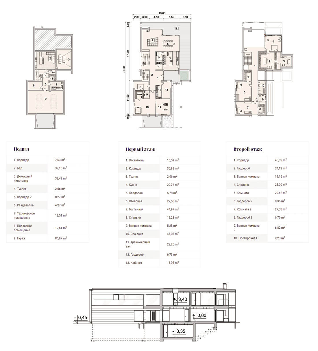 В подземном этаже предусмотрены технические помещения, гараж и развлекательная зона с баром и домашним кинотеатром. За счёт оригинального планировочного решения блоки разъединены через коридор.