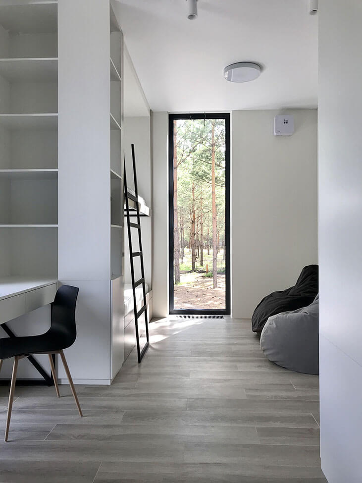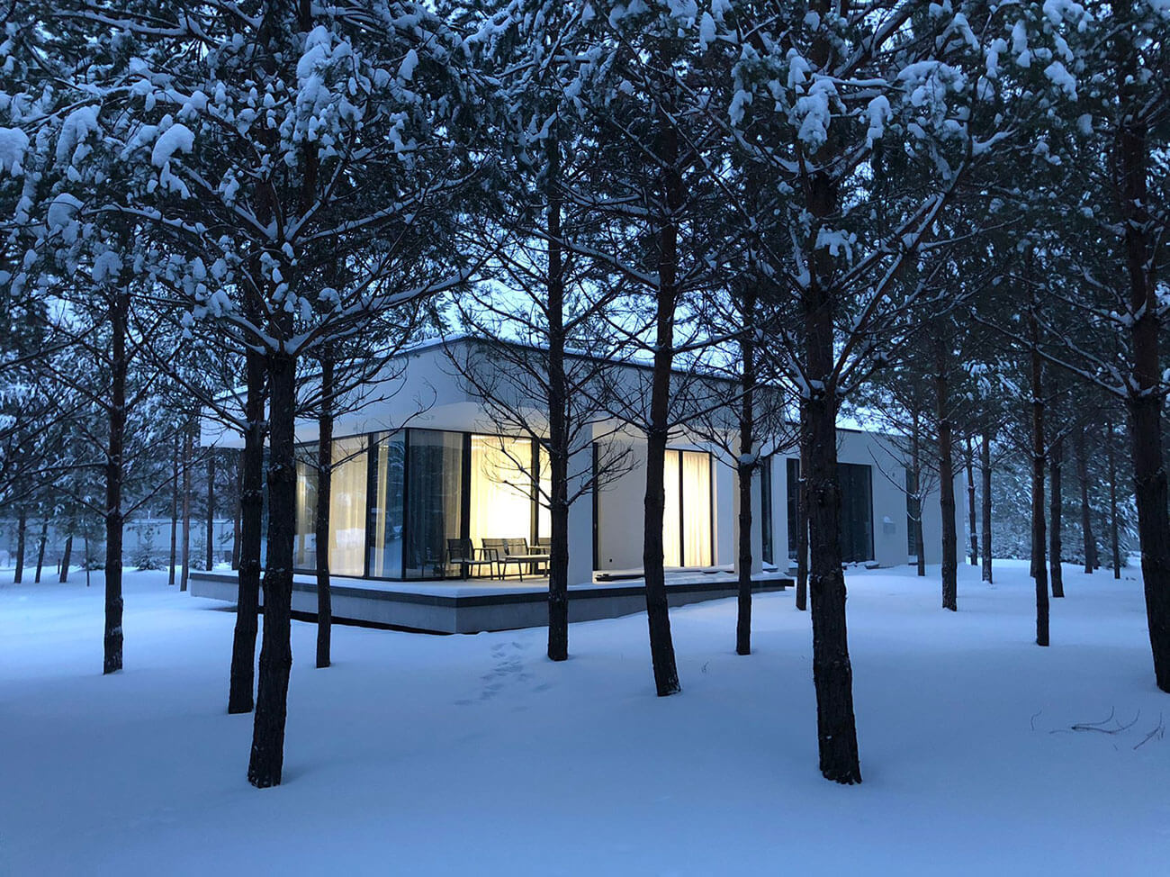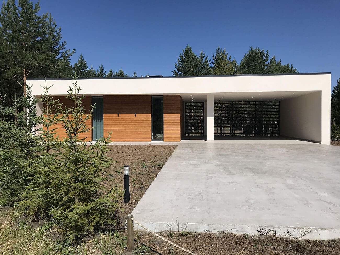 Одноэтажная вилла расположена в молодом сосновом бору и предназначена для круглогодичного проживания. Основная концепция в проектировании — это стремление стереть границы между интерьером и экстерьером дома за счет максимального панорамного остекления, перетекающего открытого пространства и таких материалов, как дерево, камень и бетон.