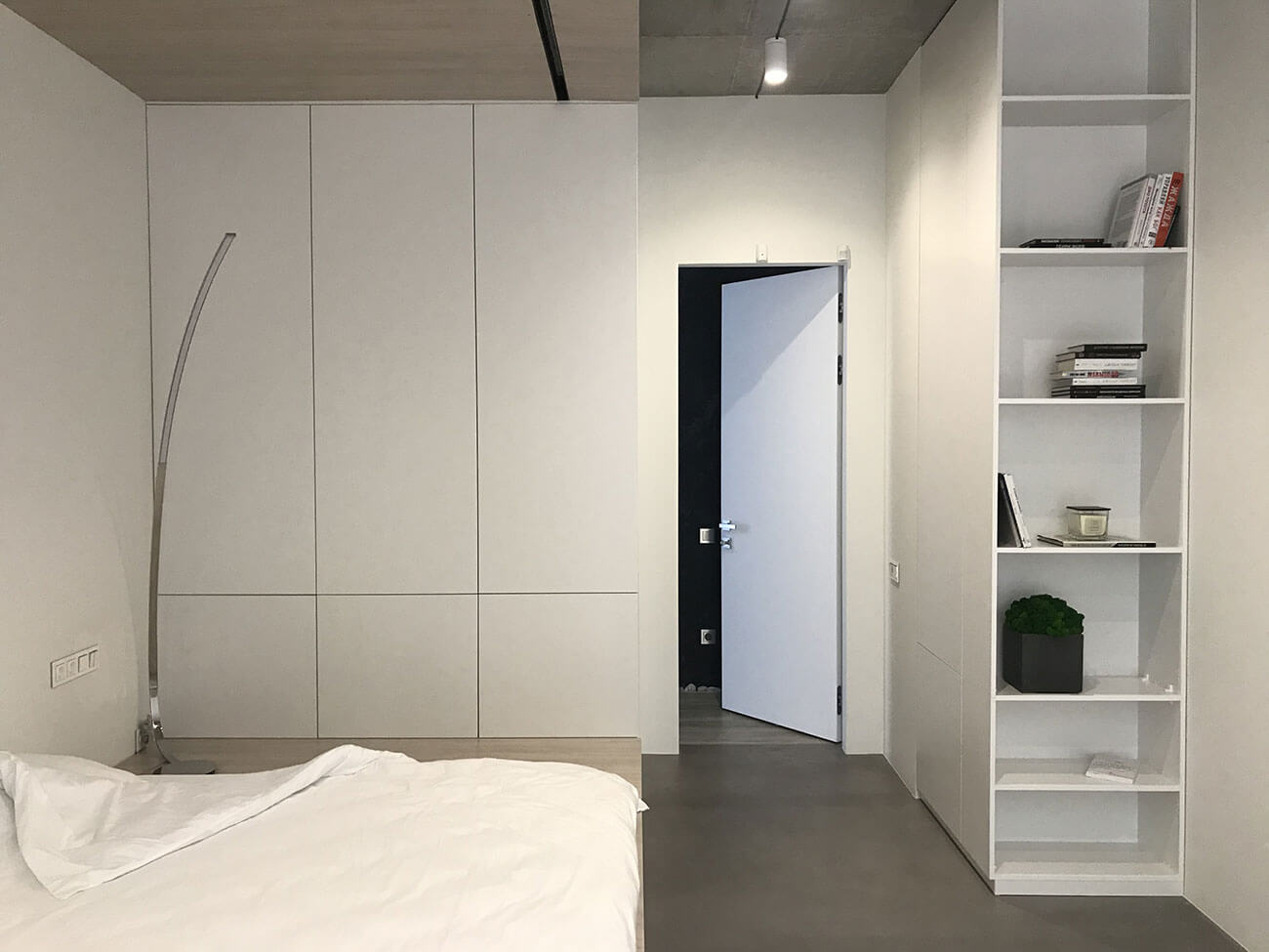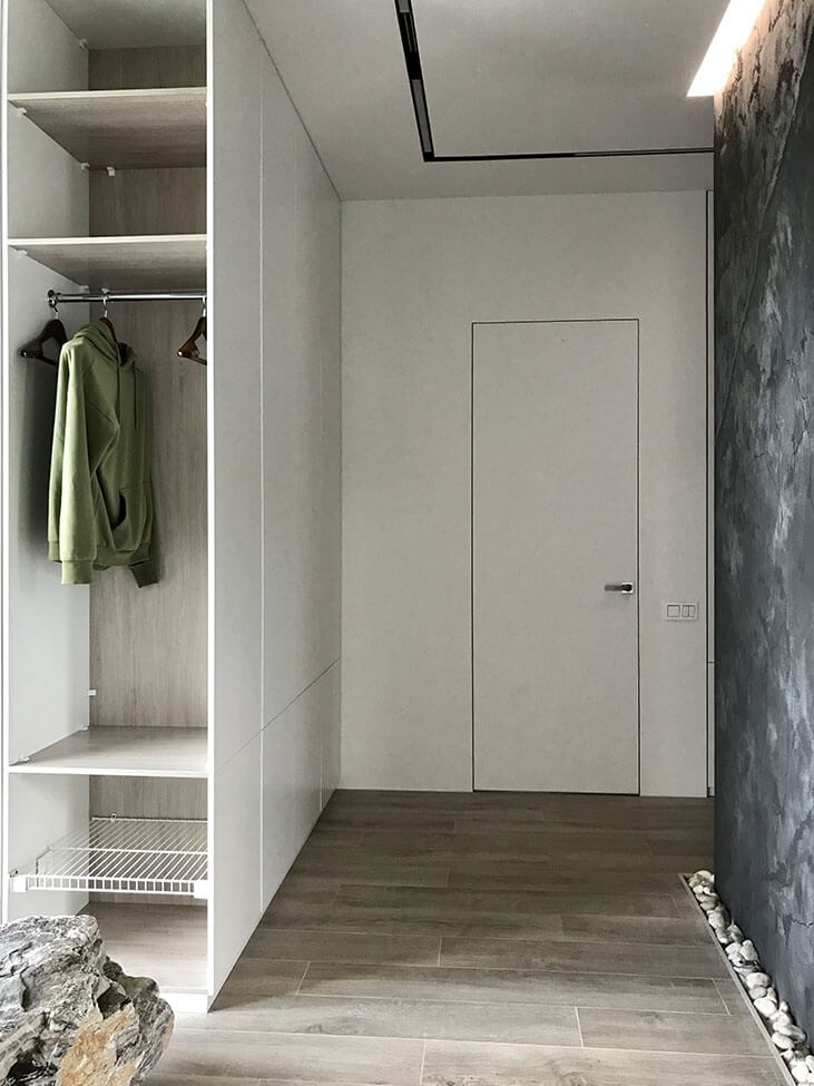 В проекте все шкафы скрыты и составляют единую плоскость со стеной или являются его продолжением.