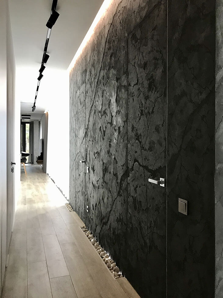- прихожая с галереей, организующие скрытые места для хранения с системами скрытого монтажа мебели, которая является продолжением стены. Вместо пуфа используется мраморизованный известняк, который прекрасно выполняет необходимую функцию.