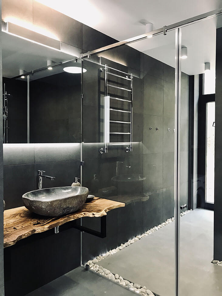 - большой санузел с душевой и сауной, из которой открывается вид на прекрасный природный ландшафт. Столешница под раковину и полки в нише выполнены из канадского дуба, а раковина сделана из речного камня.