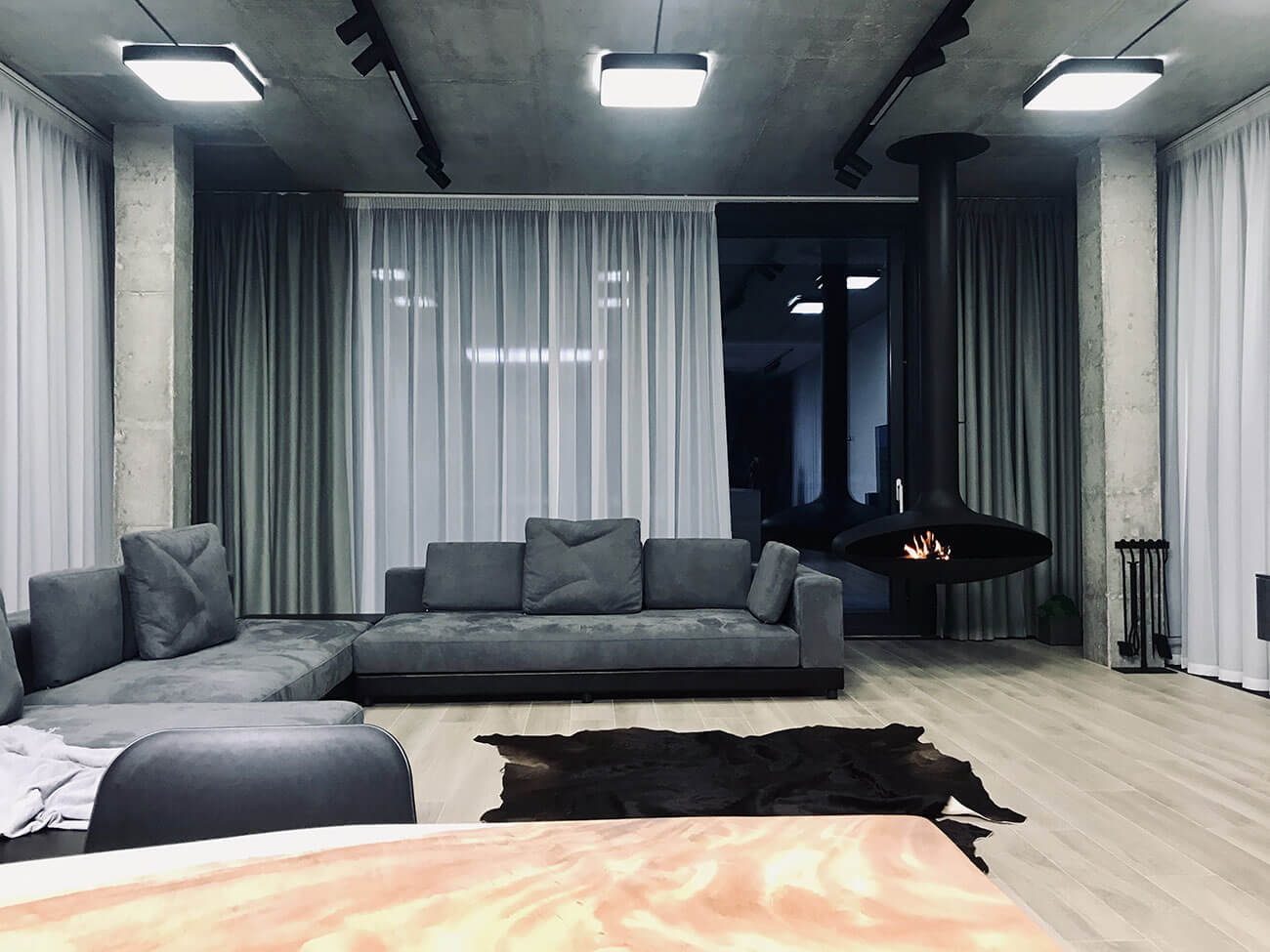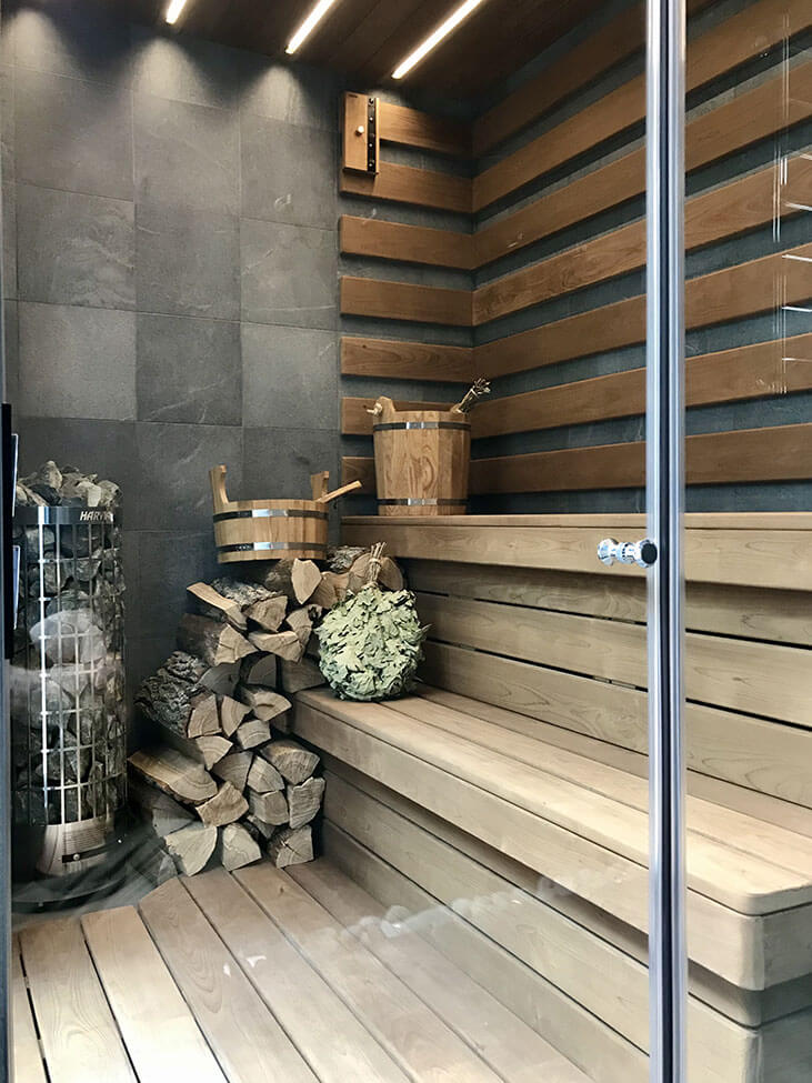 Основной изюминкой проекта является сауна с выходом на террасу и подвесной камин, который создает камерную атмосферу и уют.