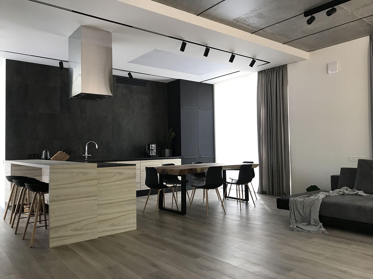 - кухня-столовая, совмещенная с гостиной. Зонирование осуществляется при помощи потолка, который заканчивается на границе барной стойки, совмещенной с рабочей поверхностью, линией стола и непосредственно самим остеклением, которое создает четкую линию разграничения. Кухонный стол — срез индонезийского дерева суар.