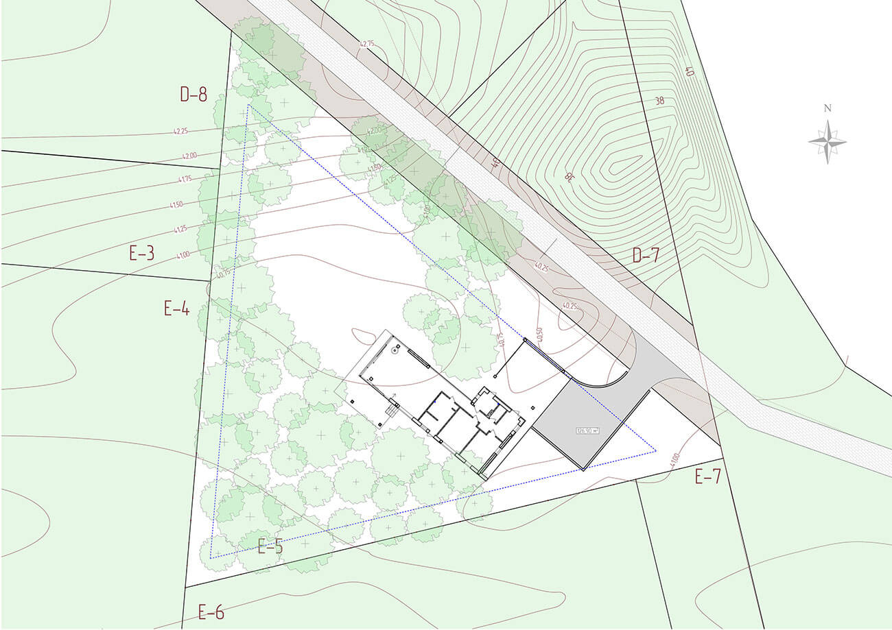 В планировке помещения распределены с учетом движения солнца и сторон света. Здание расположено на участке с учетом существующих условий, оно органично вписано в природный контекст и посажено на небольшой рельеф.