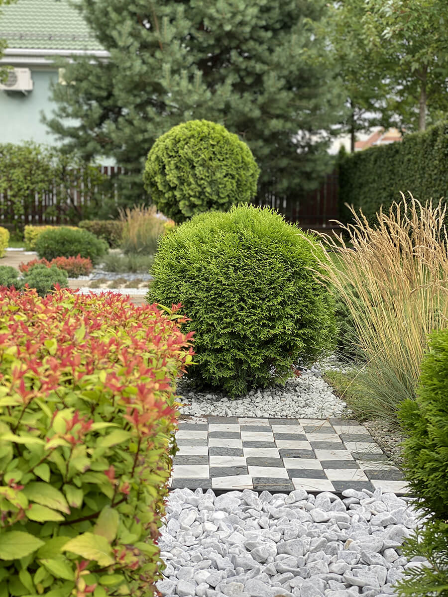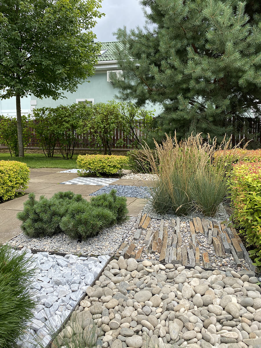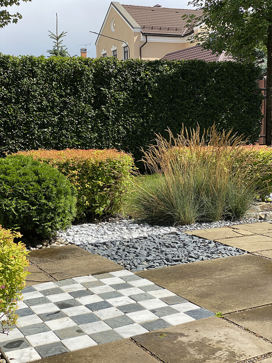 Сад разделен на модули — небольшие геометрические фигуры, которые в динамике повторяются в разных сочетаниях. Смелое использование камня, отсыпок и привычных растений подчеркивает красоту каждого из них. В дизайне использованы плитки белого и черного мрамора, из которых выложили «шахматную доску», эрклез шлифованный под названием «Хрусталь», отсыпки графитовых оттенков из шунгита, мраморной крошки, трехцветной морской гальки разных фракций. Из мозаичной плоской гальки сделали имитацию чешуй методом укладки на ребро. Повторили фрагмент отделки фасада дома, вписав в несколько квадратов полоски пиленого ростовского плитняка, таким образом дом и сад еще больше стали гармонировать.
