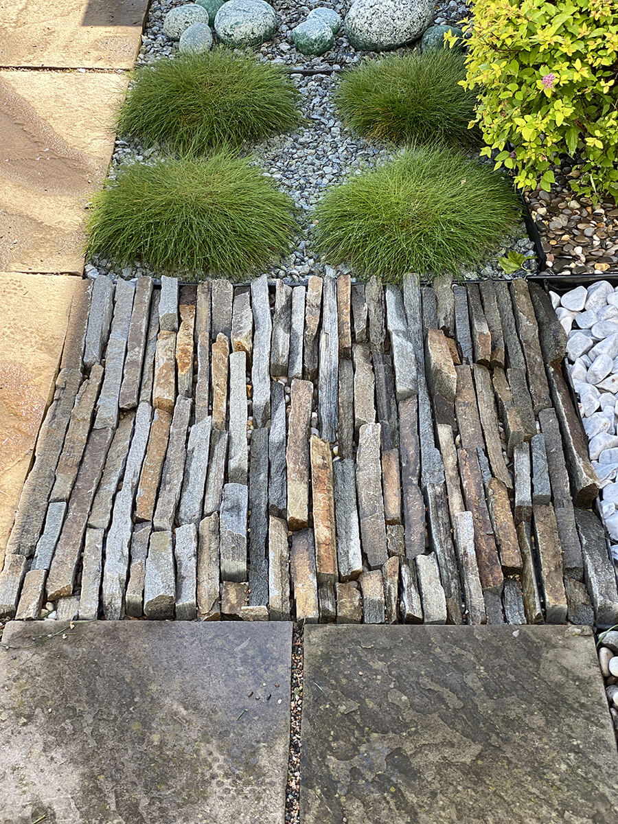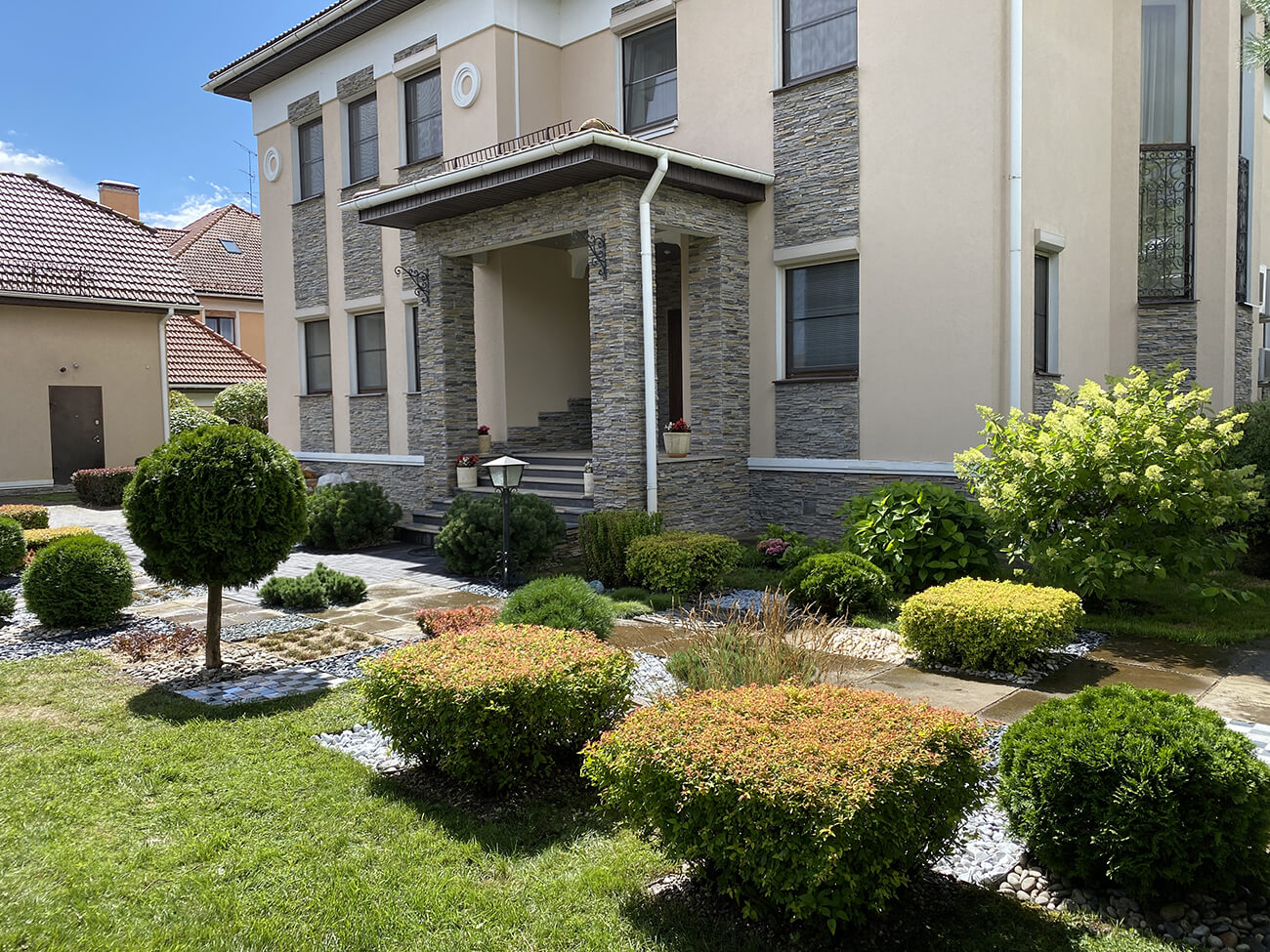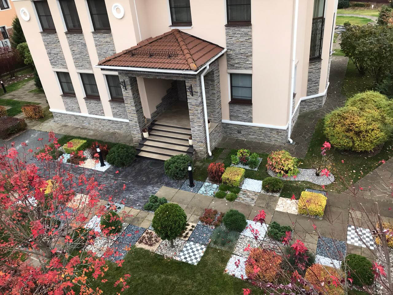 Сад разделен на модули — небольшие геометрические фигуры, которые в динамике повторяются в разных сочетаниях. Смелое использование камня, отсыпок и привычных растений подчеркивает красоту каждого из них. В дизайне использованы плитки белого и черного мрамора, из которых выложили «шахматную доску», эрклез шлифованный под названием «Хрусталь», отсыпки графитовых оттенков из шунгита, мраморной крошки, трехцветной морской гальки разных фракций. Из мозаичной плоской гальки сделали имитацию чешуй методом укладки на ребро. Повторили фрагмент отделки фасада дома, вписав в несколько квадратов полоски пиленого ростовского плитняка, таким образом дом и сад еще больше стали гармонировать.