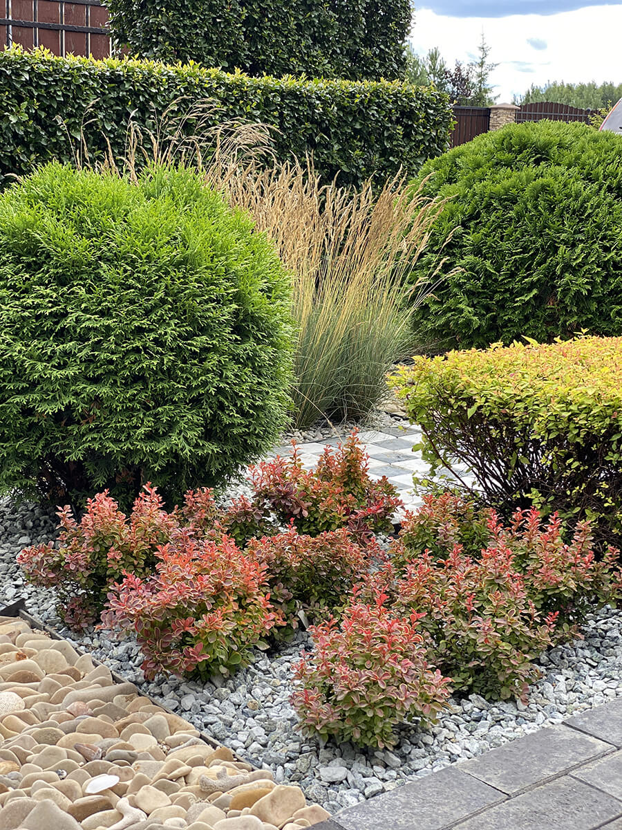 Грубая фактура камня мягко обыграна растениями в плотной посадке из барбариса сортов «Admiration» и «Erecta», спиреи «Golden Princess», туи западной «Danica», сосны горной сортов «Mops» и «Mini Mops», овсяницы сизой и овсяницы Готье, тимьяна ползучего, седума «Sunsparkler Dazzlebery». В качестве фона заднего плана — разноуровневые изгороди из кизильника блестящего, клен красный и клен «Globosum».