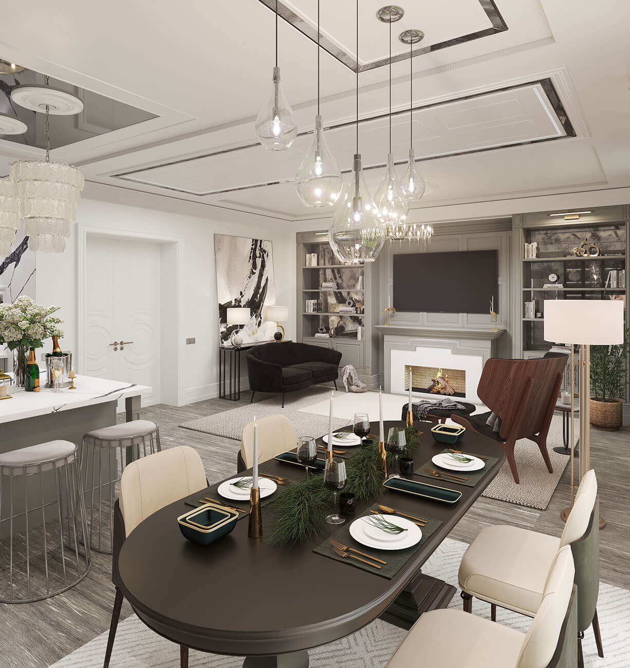 Работа с объектом началась с планировки, где требовалось зонировать первый этаж и сформировать эргономичное пространство для большой кухни-гостиной с функциональным кухонным гарнитуром, с обилием мест для хранения и техники. Главная композиционная доминанта гарнитура — варочный центр и вытяжка. Вытяжка выполнена по индивидуальным чертежам, в характерной стилистике, графично подчеркнутая зеркалом с эффектом старения. Высокая витрина для хранения коллекционной посуды с подсветкой является украшением зоны обеденного стола. Столовая группа на шесть персон и кухонный остров с встроенным винным шкафом — центр притяжения данного помещения.