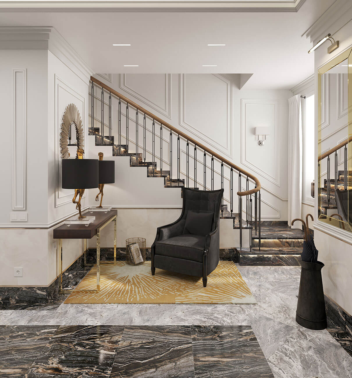 Цветовая гамма 1-го этажа сдержанна и монохромна, с небольшим добавлением комбинации желтого и синего, с теплой подсветкой «лунного света», которая отражается в природных текстурах натурального камня, используемого в отделке.