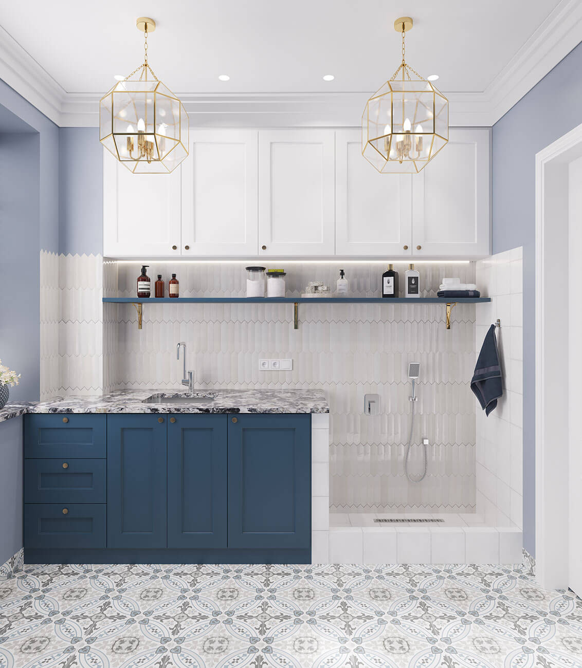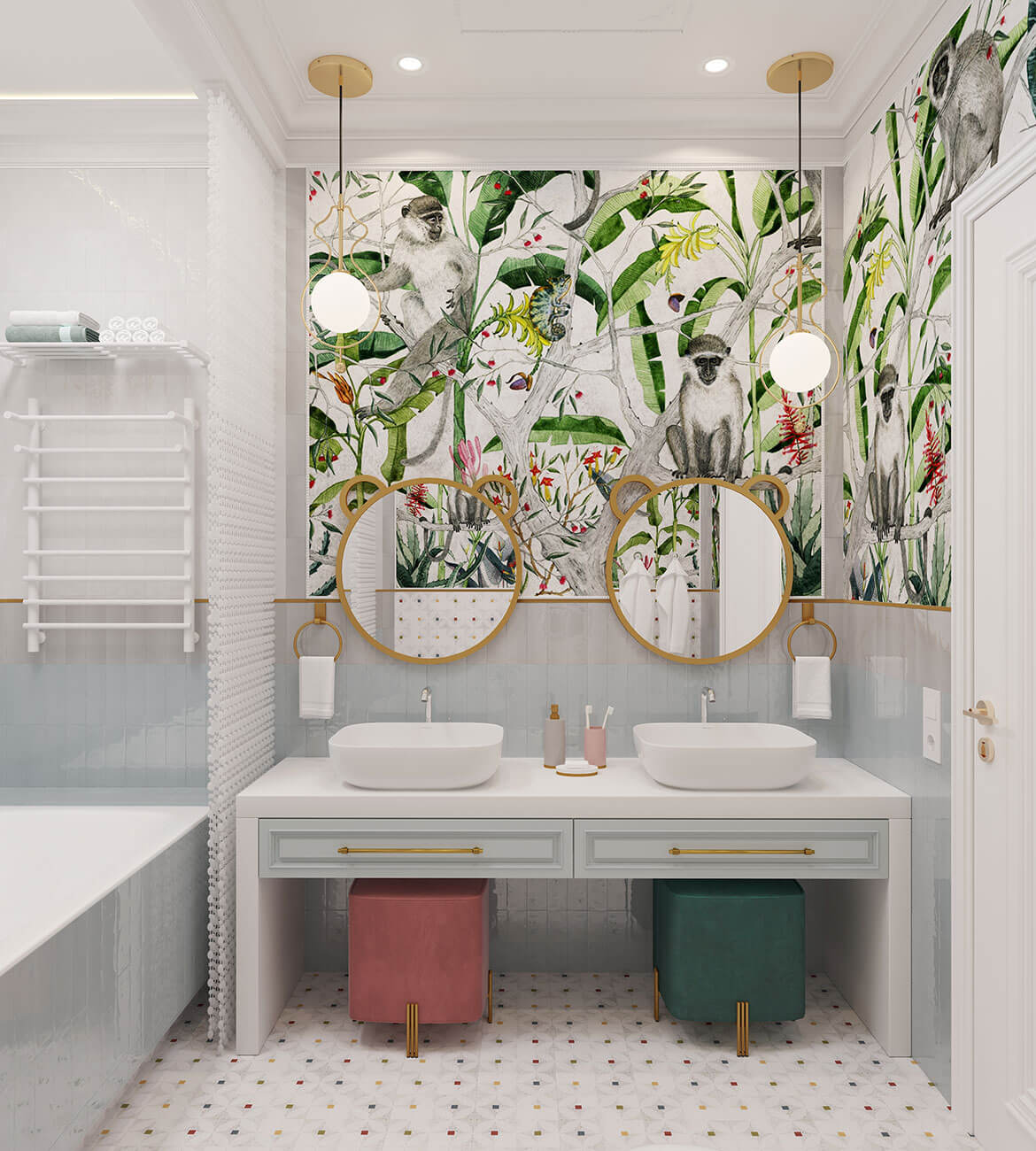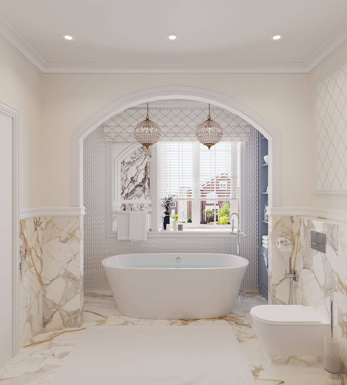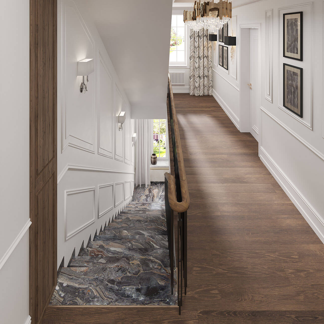 На 2-м этаже мягкие оттенки дерева, пастельные стены с геометричным рисунком, классические зеркальные поверхности и отделка с эффектом старения.